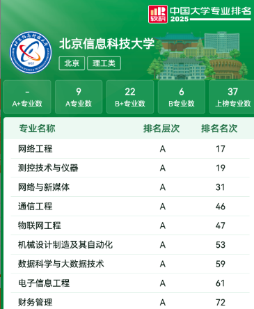 北京信息科技大学:以信息科技为核心办学方向,在软科2025专业排名中,共有37个专业上榜,其中9个专业获评A层次,22个专业获评B+层次。网络工程(全国第17)、测控技术与仪器(全国第19)等专业跻身全国前列,通信工程、物联网工程等信息类专业均为A层次,覆盖网络通信、物联网、大数据等核心领域。