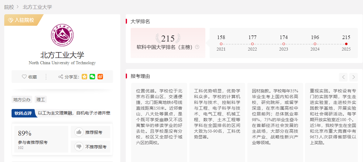 在权威的软科2025中国大学排名中,两所院校的位次差异直观体现了综合实力的差距:北京信息科技大学位列全国第204位,北方工业大学位列全国第215位,北信科领先11个位次。从排名趋势来看,北方工业大学近年位次有所下滑,而北信科保持稳定提升,这一变化也反映了学校在学科建设、人才培养等方面的持续进步。