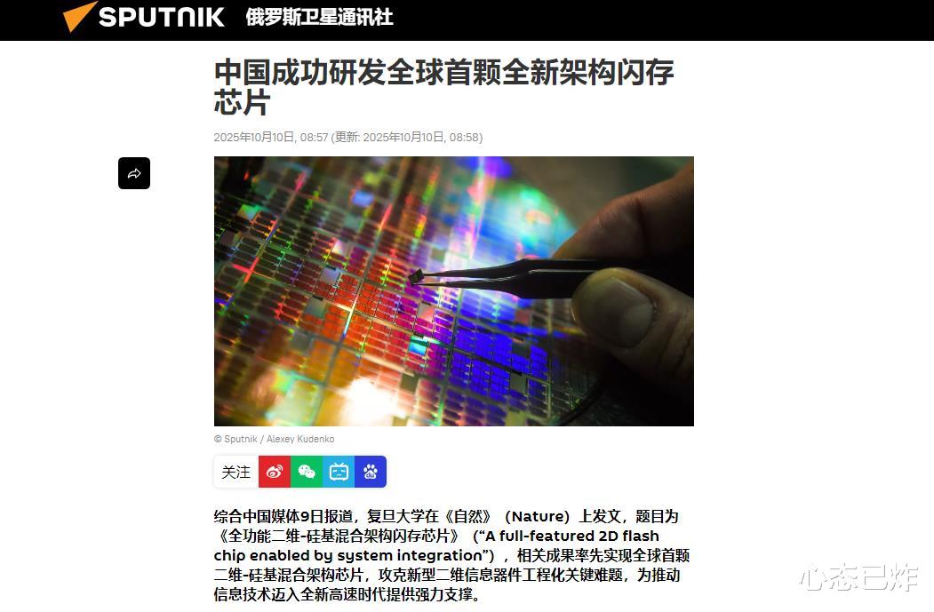 10月11日据俄罗斯卫星通讯社报道,上海的复旦大学在《自然》上发文,题目为《全功能二维-硅基混合架构闪存芯片》,这篇文章详细介绍了复旦大学叫科学团队攻克新型二维信息器件工程化关键难题,研发成功了全球首颗二维-硅基混合架构芯片,这种架构的芯片最大优势就是速度,如果实现量产,向推动全球信息化进入高速时代。