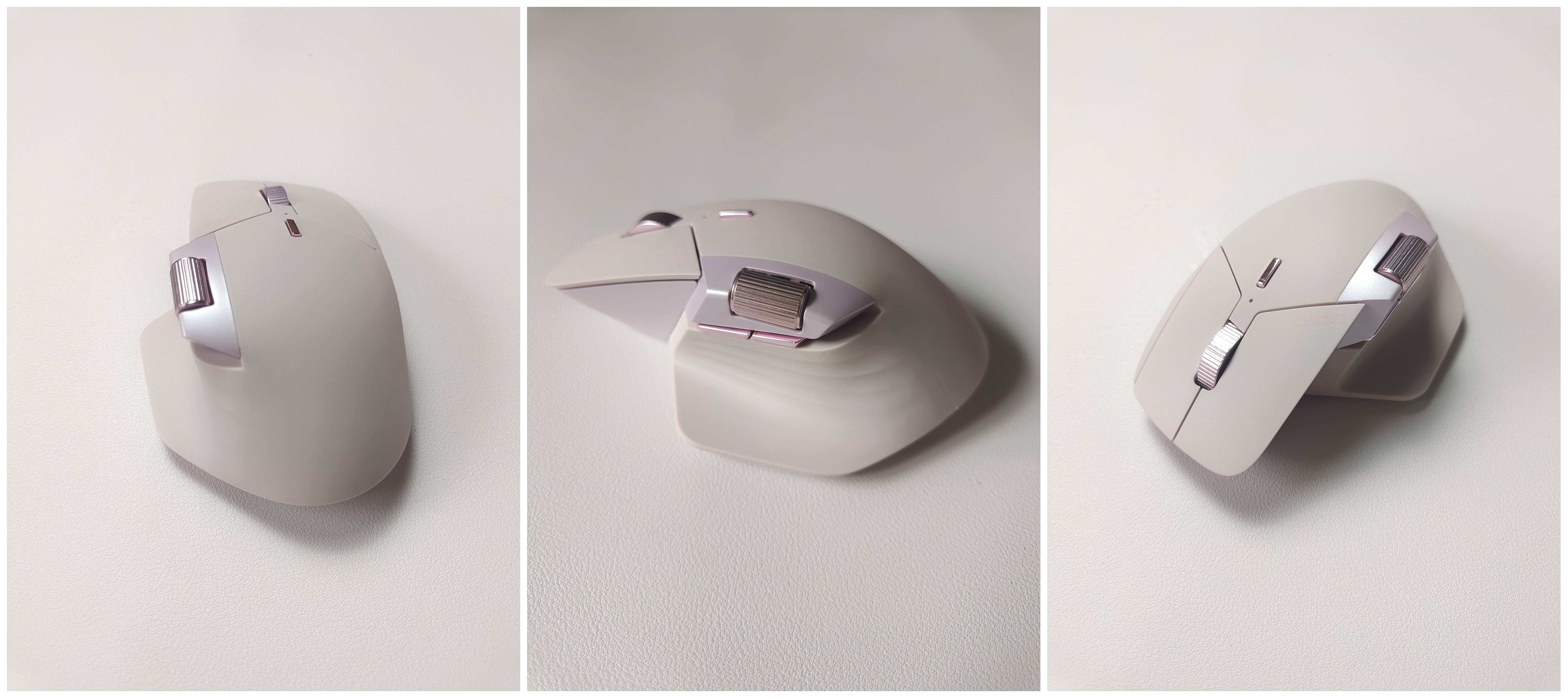 我这只MT760mini是粉紫色的,背面接触面采用了两种材质,主要接触面采用的是类肤质软胶材料,侧面采用的是珠光材质,blingbling我很喜欢。滚轮则用了金属材质,光泽感很好,精致感拉满。