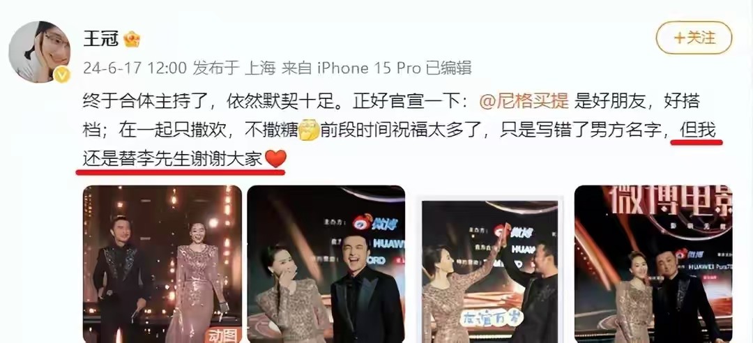 李咏的妻子哈文还特意晒出了和王冠的合照,配文“我们家的好朋友”,以此来证明两个人的清白。