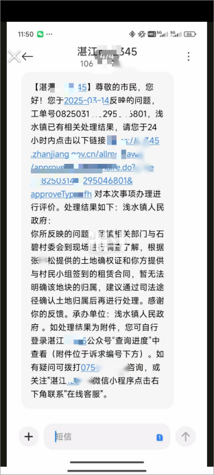 2025年3月14日,张女士家人收到第二条热线反馈,告知因张某松提供了自行办理的土地确权证,而出租方提供了租赁合同及土地承包经营权证,暂无法明确地块归属,建议通过司法途径解决。