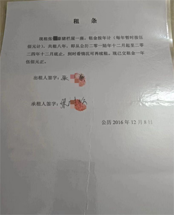 2016年,同村村民张某松(因母亲改嫁同村陈氏又名陈某咏,村内多数人仍称其张某松)找到张某豪,提出租赁该猪栏屋经营洗碗厂。当时张某豪已病重,便委托儿子张某燊与张某松对接签约,双方签订手写租条,明确租赁期限为8年(2016年12月至2024年12月底),年租金500元,张某松支付首年租金。
