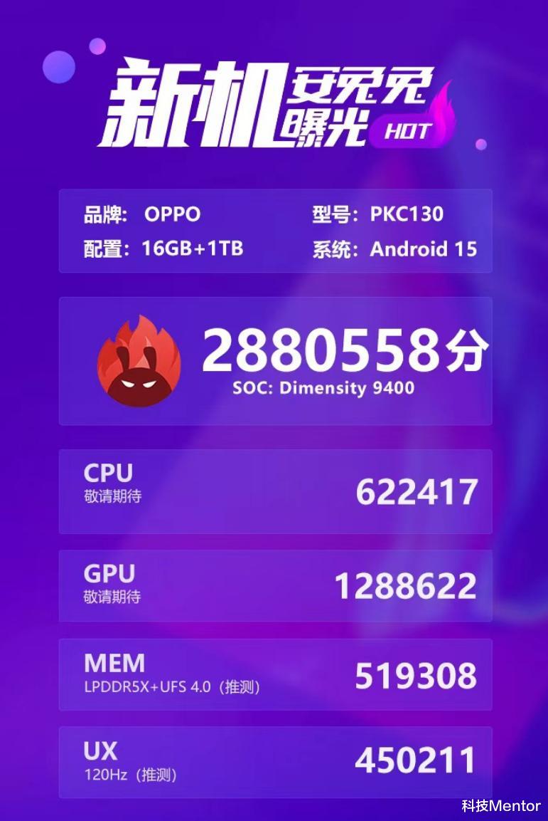 此次曝光的OPPO新机搭载了联发科最新旗舰芯片天玑9400,这颗采用台积电3nm工艺制程的芯片,在性能方面有着非常出色的表现。从安兔兔跑分成绩来看,该机综合得分高达2880558分,其中CPU、GPU、MEM以及UX成绩均达到了新款旗舰平台的水准。