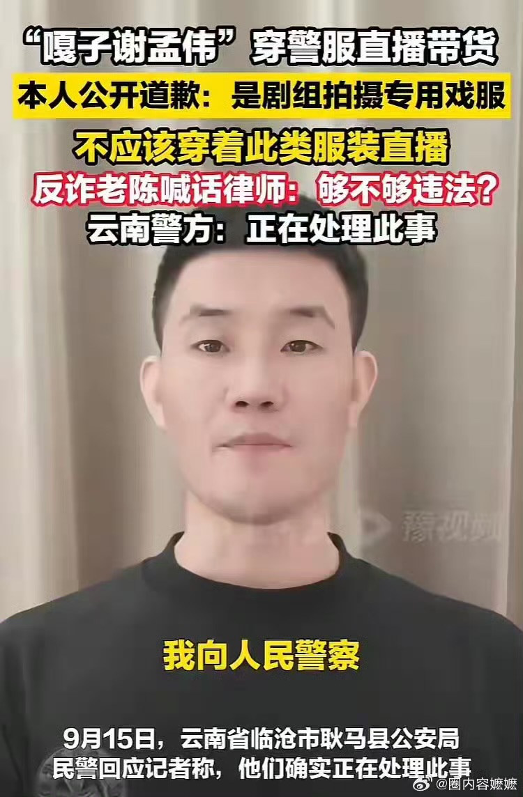 云南耿马县拍摄现场,嘎子谢孟伟一身警服、肩章臂章齐全,出现在直播间卖充电宝。网友瞬间截图:没警号也一眼认出是人民警察制式服装。弹幕刷屏“合适吗?”辽宁李先生直接拨打110,警方一句“正在处理”把事件推上热搜。法律条文随之被翻出:非拍摄时段穿警服需省级公安批准,直播带货显然不在“演出”范围。
