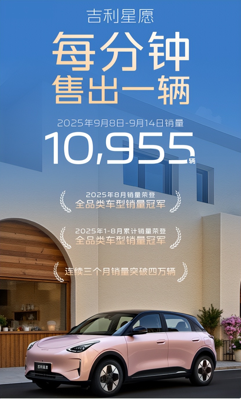 吉利星愿自上市以来销量一路高涨,9月8日-9月14日,单周销量高达10955辆,平均每分钟就有一辆成交;更拿下2025年8月全品类销冠,1-8月累计销量稳居榜首,连续三月破四万。这款6.58万起(置换+国补)的纯电车型,凭“安全兜底+实用拉满”的硬核组合,成了消费者的心头好。