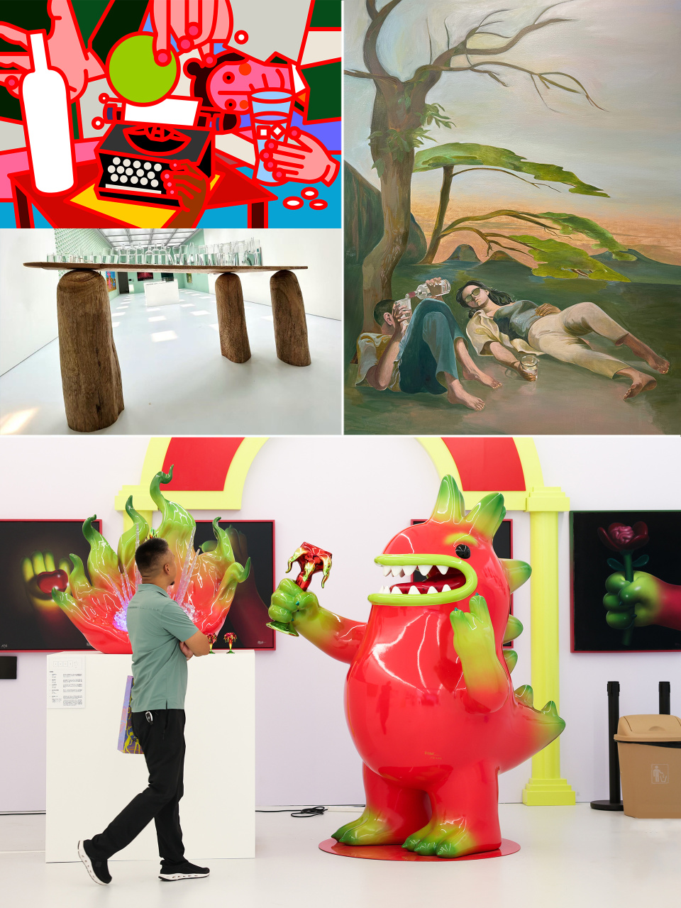 图下部:张超级,《举杯就干1573》,2025,玻璃钢烤漆、透明树脂、不锈钢电镀,火龙果酒托:117 × 85 × 116 cm、火火龙雕塑:150 × 170 × 220 cm、火龙果酒杯:67 × 67 × 12 cm、火龙果瓶盖:10 × 10 × 12 cm,致谢艺术家