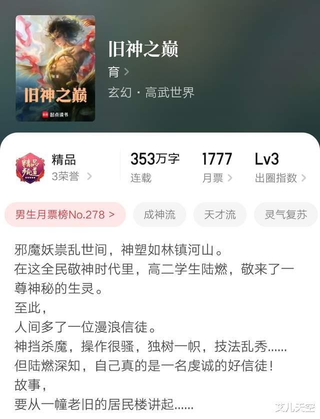 昨晚看到大神“育”的小说《旧神之巅》完结了,今天又看到起点推送了柳岸花又明老书《我真没想重生啊》破了十万均订的消息,这期简单跟大家看看。