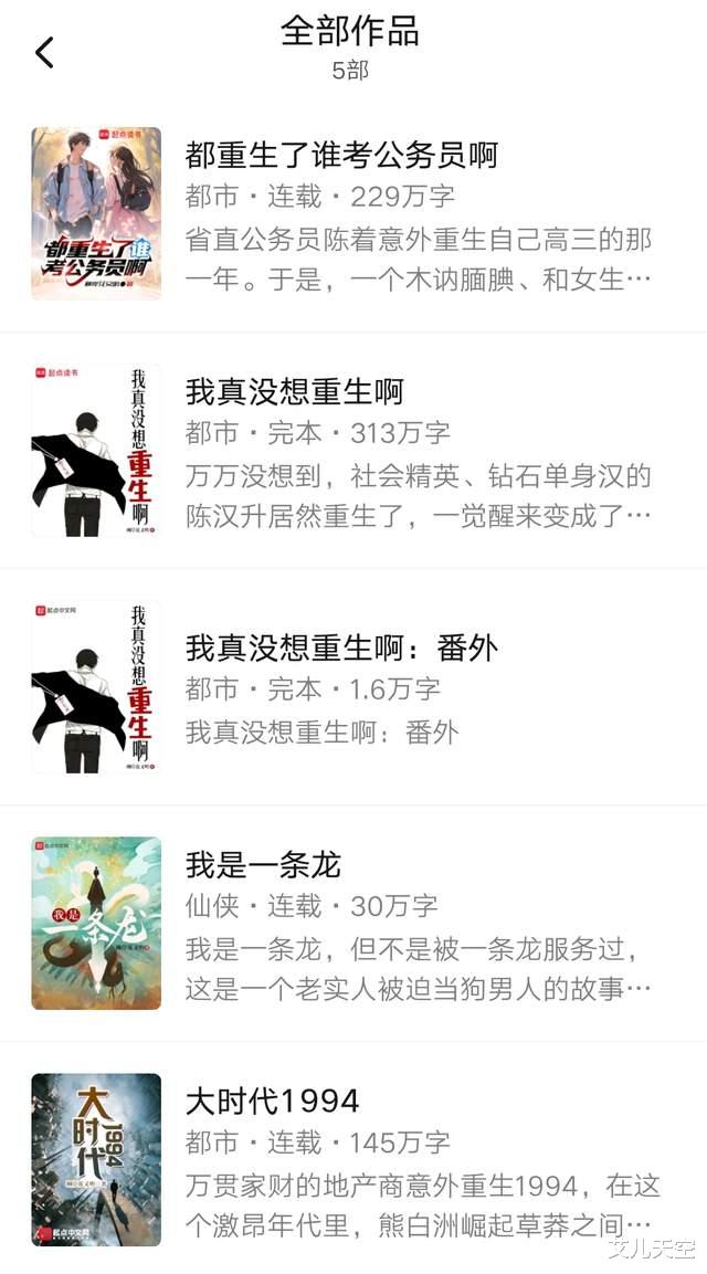 而除了没想重生、公务员,柳岸花又明还有两本小说,一本早期的《大时代1994》,这本小说被封了才有了陈汉升,隔了几年才解封,另一本《我是一条龙》是他对仙侠的尝试,就是反响比较差,后来因工作调动更是直接断了,两本估计都很难再续上了。