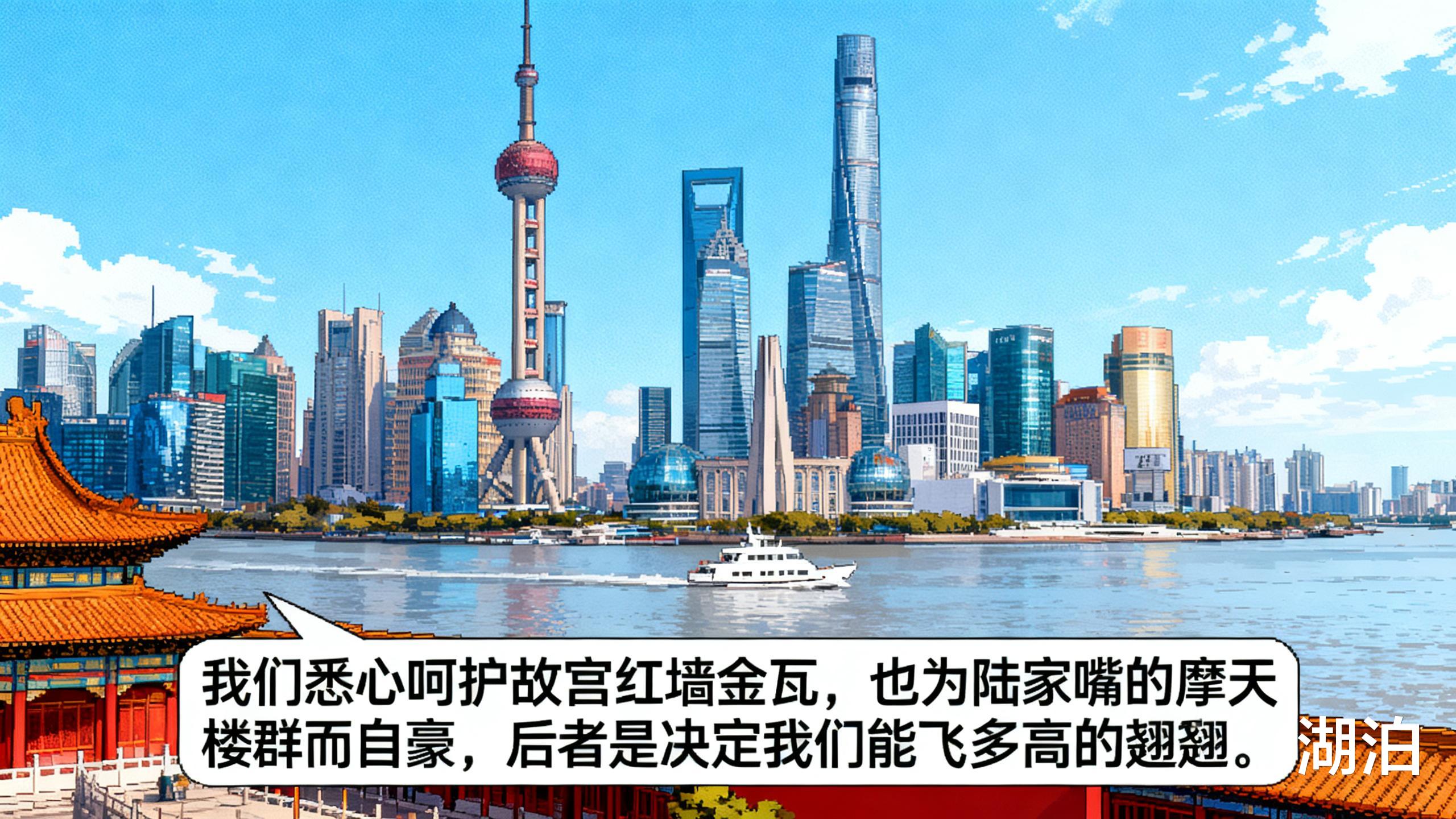 我们悉心呵护故宫的红墙金瓦,也为陆家嘴的摩天楼群而自豪;我们修复古寺的斗拱飞檐,也为港珠澳大桥的雄伟而赞叹。前者是我们的根,告诉我们从何而来;后者是我们的翅膀,决定我们能飞多高。