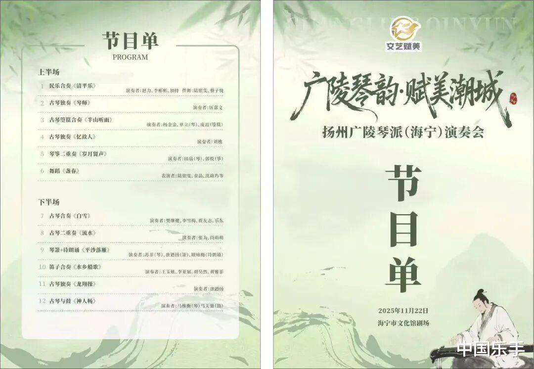 当运河琴风跨越千里与钱塘潮声相遇,当古琴雅韵碰撞筝音婉转,一场震撼人心的艺术盛宴在海宁市文化馆圆满上演。“广陵琴韵·赋美潮城”扬州广陵琴派海宁演奏会吸引近500位观众到场,扬州市非遗协会副会长田泉、常务理事马维衡、理事苏菲、单立、郭悦以及多位会员豋台献演。两地以琴为媒,为观众献上了一场高密度、高水准的视听盛宴。