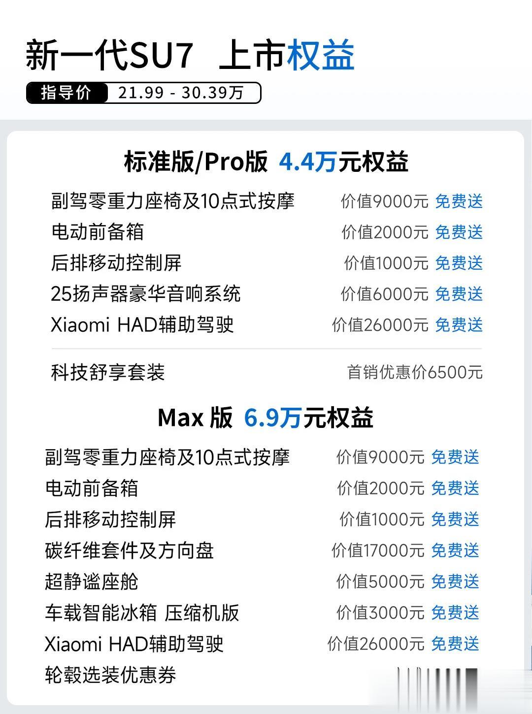 一、SU7标准版价格21.99万,而SU7Max价格在30.39万,两者的差价在8.4万元,再算上保险和购置税差价,这个价格差会进一步拉大。