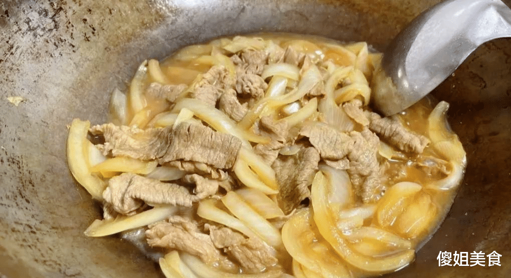 第四步:开火,锅里倒点油,油热了下洋葱丝,翻炒到洋葱变软,闻到那股甜丝丝的香味儿了没?这时候把烫好的肥牛卷倒进去,一起翻炒几下。