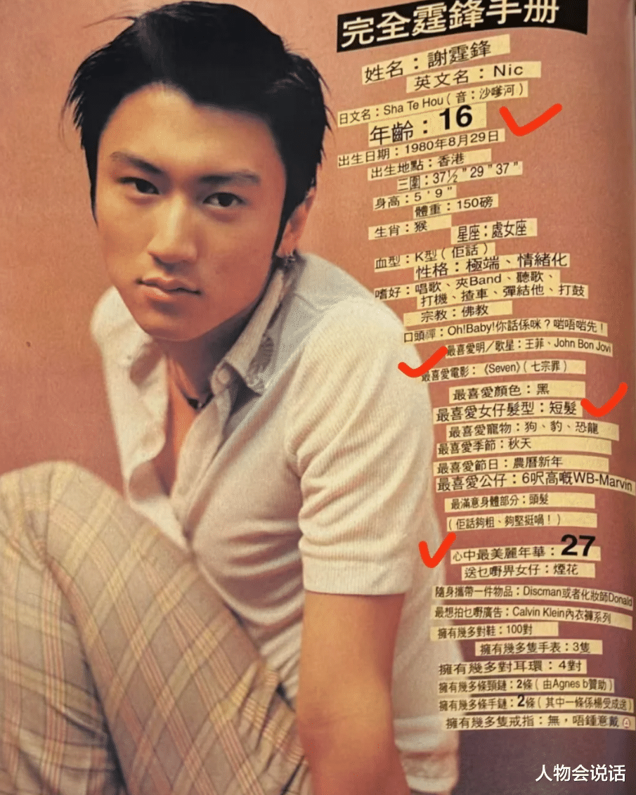 也有网友考古到,谢霆锋刚出道时,就在访谈里公开过,自己最喜欢的明星就是王菲,心中最美年龄是27岁,最喜欢的女孩发型是短发。而巧合的是,彼时王菲正好是27岁,短发。