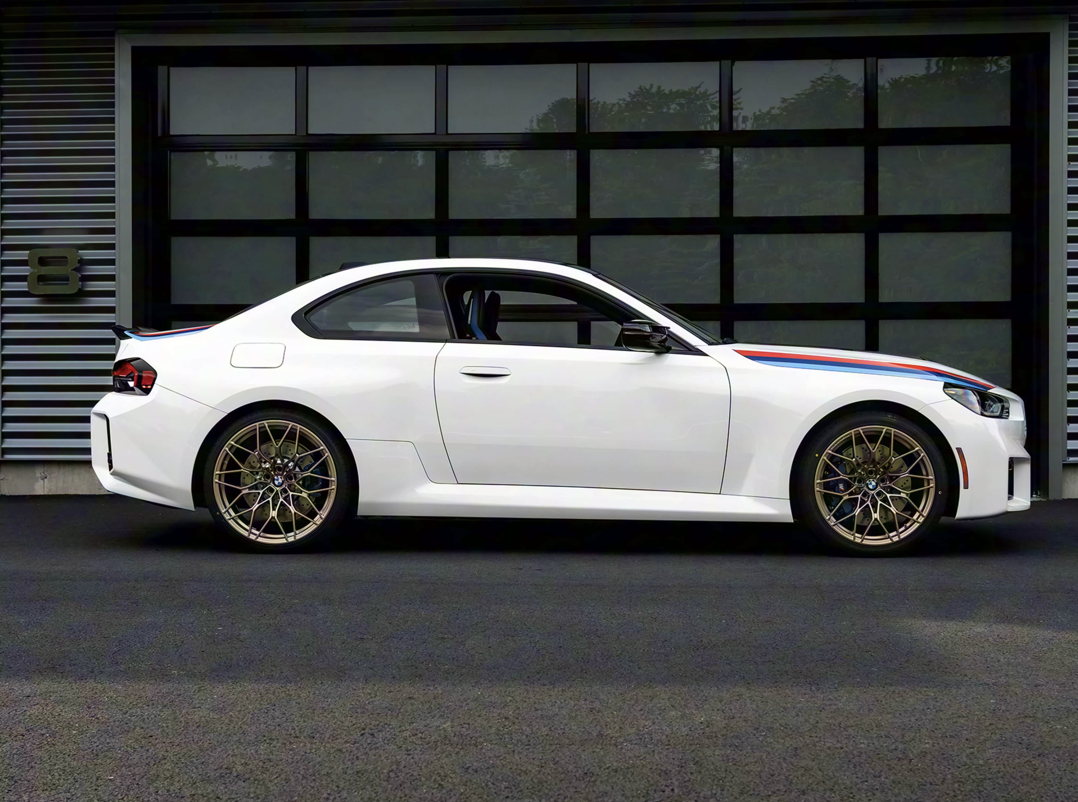 全新的宝马M2 xDrive的车身采用了双门四座轿跑结构,弧线形的车顶搭配着黑色的车窗饰条,就连倒车镜外壳也加入了碳纤维材质,看上去更加高级,也更加轻量化。隐藏式的门把手让车身变得更加简约、耐看,也降低了风阻系数。配备了19英寸铝合金轮圈,搭配着前235/45、后265/40的宽胎,银色的大尺寸刹车盘和蓝色的刹车卡钳,将性能车的优雅、运动气质展现的淋漓尽致。尺寸方面,宝马M2 xDrive长宽高分别为4650*1811*1460mm,轴距2810mm,相比于现款的宝马M2更加长、更扁、更宽。车重接近1900公斤,比后驱版车型重约70公斤。