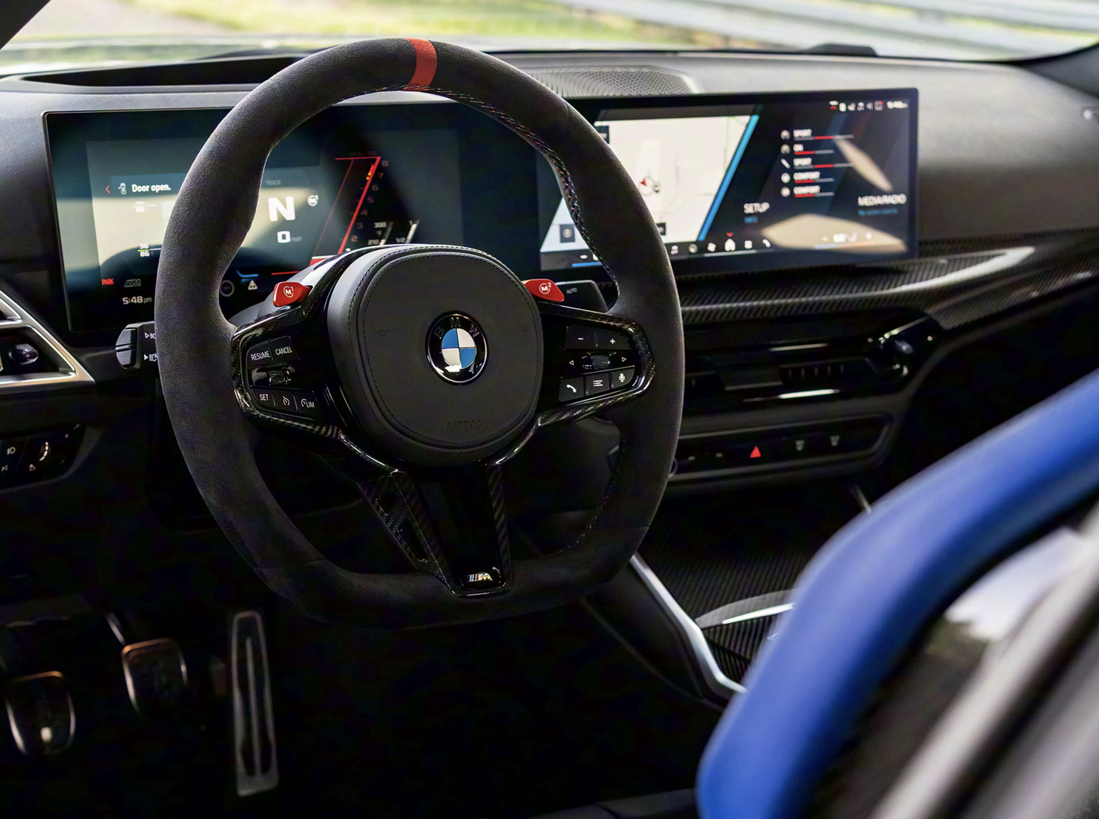 新一代宝马M2 xDrive车内也变得更加激进,配备了小尺寸方向盘采用了麂皮绒材质包裹,并加入了大尺寸换挡拨片和M+、M-拨片。再配上经过轻量化处理过后的碳纤维一体式赛车座椅,人体工程学设计的换挡手柄和红色一键启动按钮,瞬间点燃了埋藏在驾驶员激烈心底里那份儿激烈的驾驶欲望。配备了12.3英寸数字仪表盘与10.25英寸中控屏组成的横跨仪表盘,仪表盘能显示出g值雷达图、输出功率以及扭矩输出等信息。搭载了iDrive 8.5系统,集成导航、娱乐、车辆设置等功能,支持Apple CarPlay、Android Auto以及手势控制。