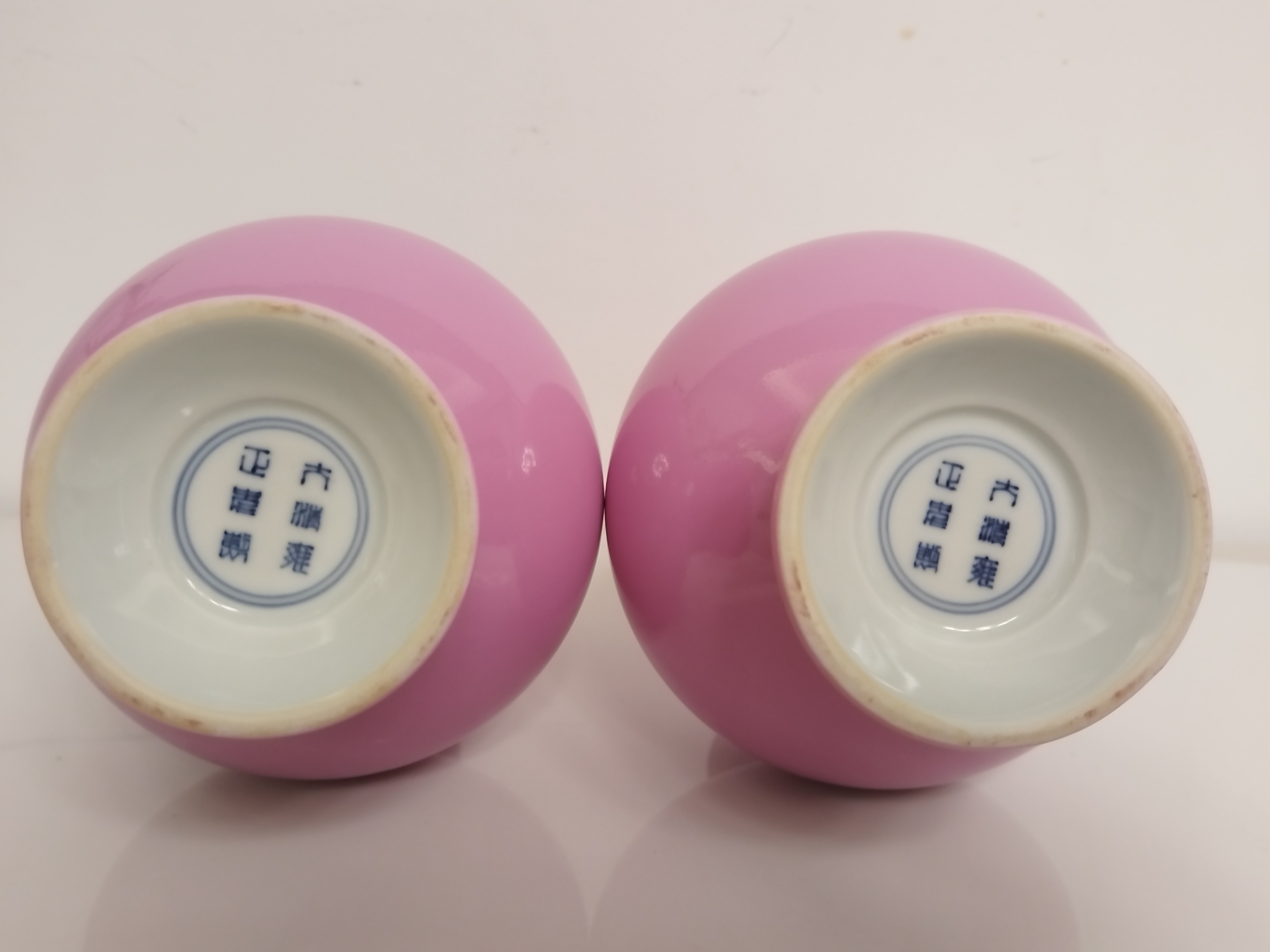 这对雅瓶以雍正朝经典淡粉釉装饰,釉色匀净柔润,如淡紫烟霞凝于瓷身。“竹颈” 造型仿生精妙,颈部竹节纹理清晰,与圆腹、束腰底座形成 “刚柔相济” 的线条张力。粉釉烧制需精准把控温度与釉料配比,竹颈造型在烧制中极易变形,成对保存完好,足见工艺水准之高。底部 “大清雍正年制” 青花款识,字体规整,是官窑身份的权威印证。