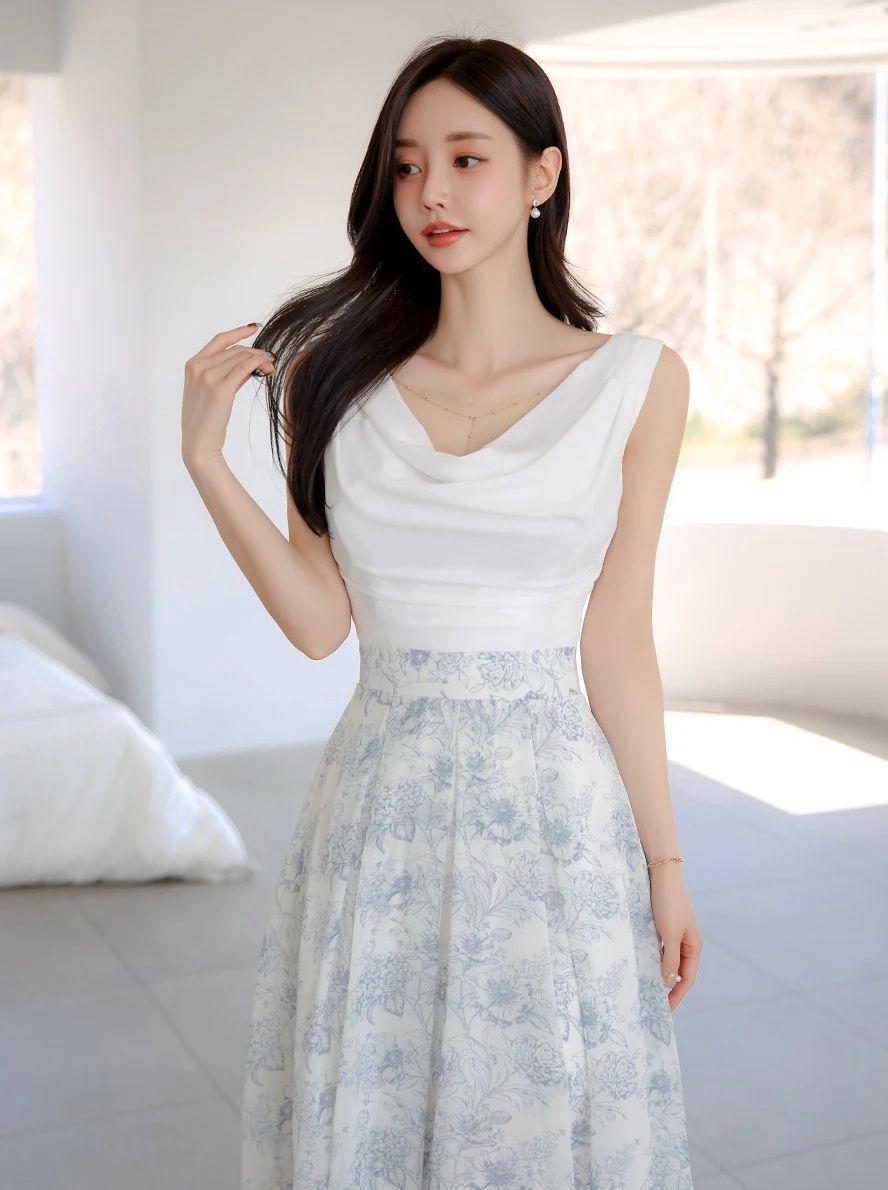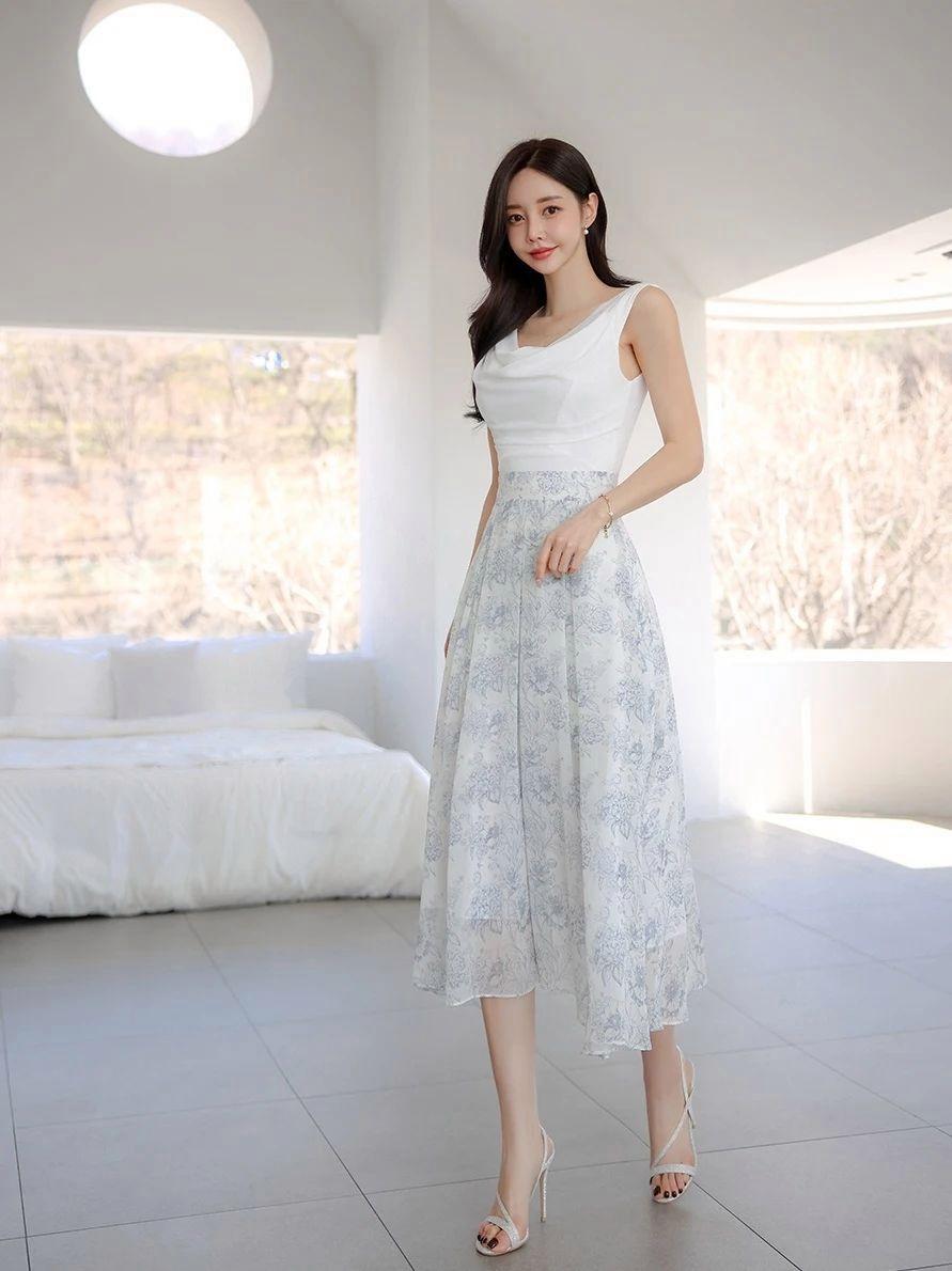 这套穿搭堪称当代时尚美学的完美诠释:白缎上衣的极简主义与碎花纱裙的浪漫主义碰撞出令人心醉的火花。领口处精致的褶皱设计宛如绽放的百合花瓣,袖口的微喇剪裁则像优雅的天鹅展翅,每一个细节都经过精心考量。纱裙上点缀的碎花图案犹如散落的星辰,在行走间流转生辉,与上衣的纯净白形成绝妙对比,恰似水墨画中的留白与着墨,虚实相生,韵味无穷。孙允珠以她特有的气质将这套装扮提升至艺术境界——既有蒙娜丽莎般的含蓄典雅,又带着维纳斯的摄人心魄。当她款款而行时,纱裙荡漾的波纹仿佛将整个T台变成了波光粼粼的湖面,而她就是那湖心最耀眼的明珠。这不仅仅是简单的服装展示,更是一场关于女性魅力的视觉诗篇,让人不禁想起徐志摩笔下"最是那一低头的温柔,像一朵水莲花不胜凉风的娇羞"的绝美意境。