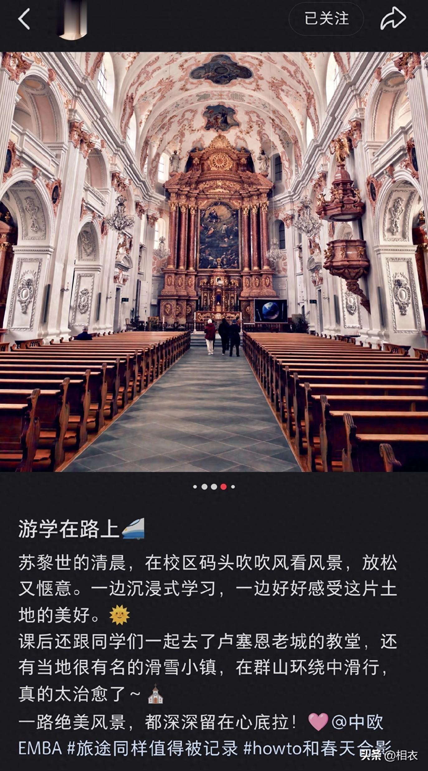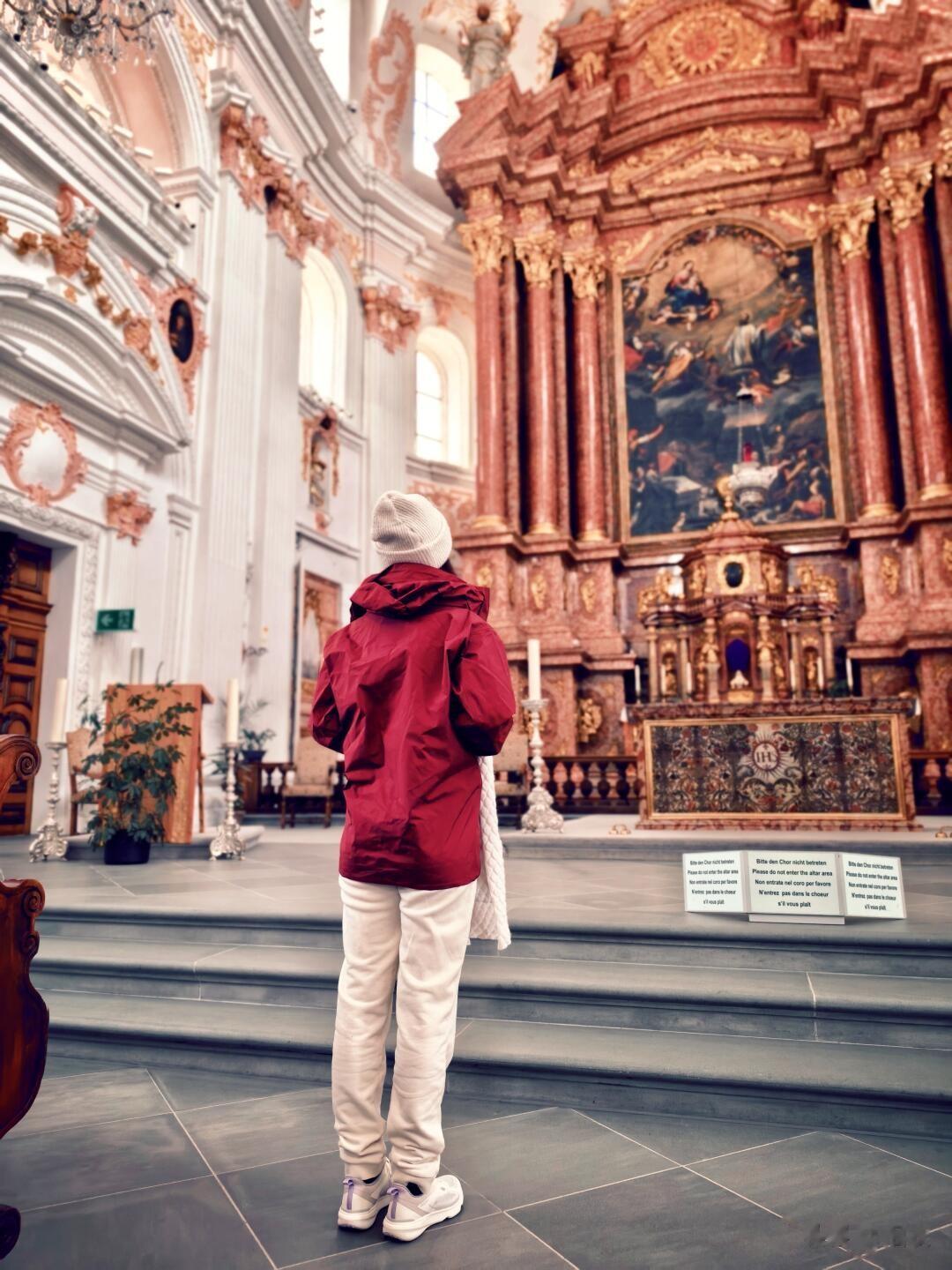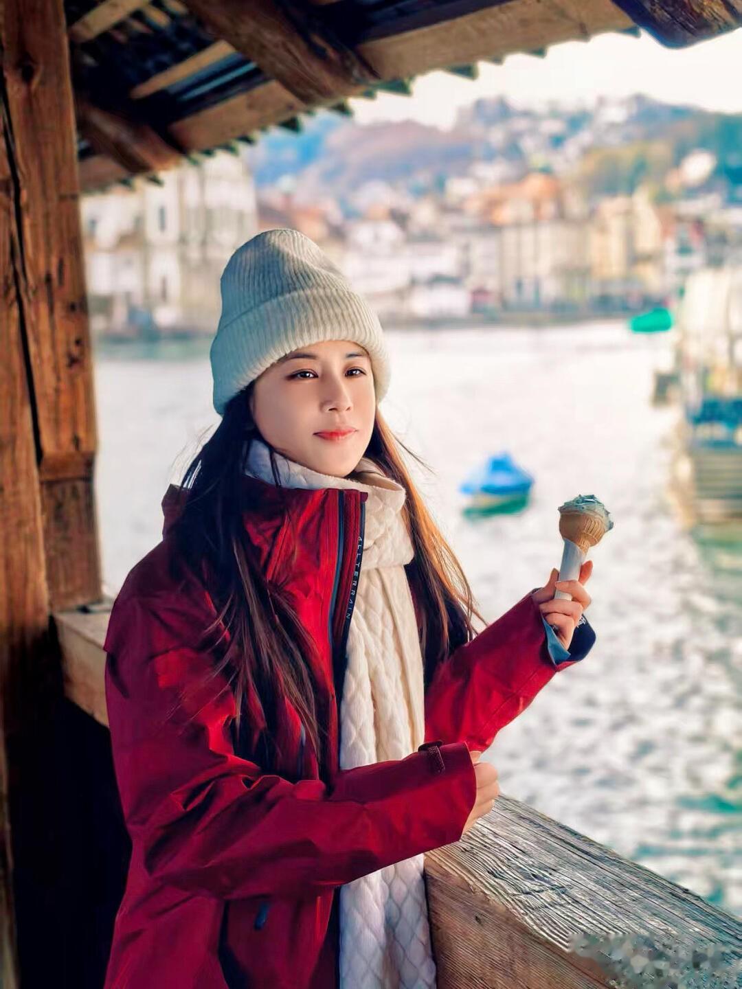 她的课余生活也很丰富,她和同学结伴去打卡卢塞恩老城的复古教堂,那里的欧式建筑恢弘又精致,雕花的穹顶氛围感十足,黄圣依穿梭在这些建筑当中,安静地感受着人文底蕴,整个氛围静谧又浪漫。