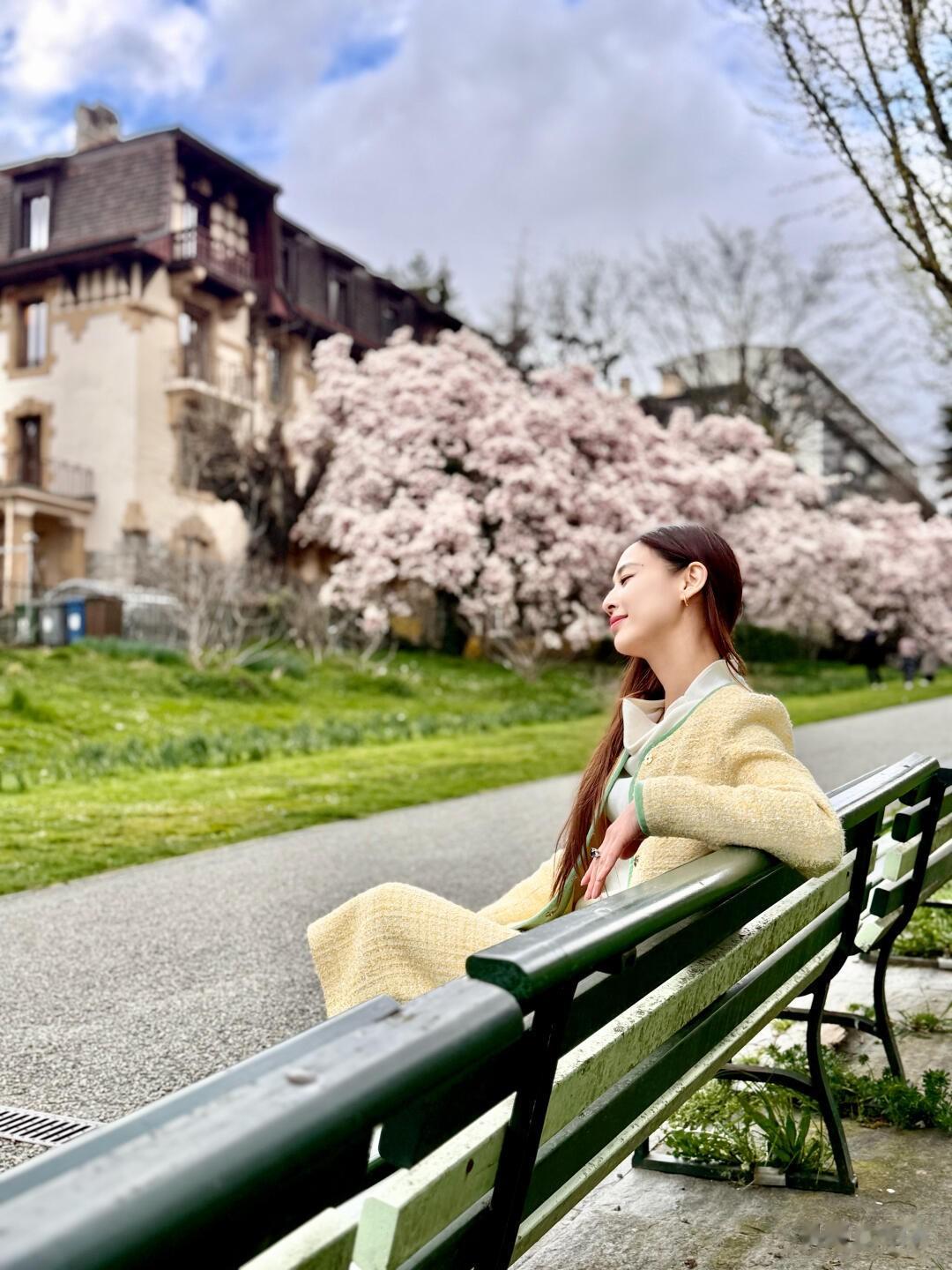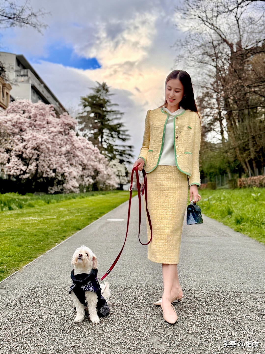 黄圣依漫步在瑞士的街头,春天的景色格外动人,街边的花朵开得很繁盛,草地也是绿油油的,她穿着一套温柔的小香风套装,牵着一只小狗悠闲地散步,她的穿搭精致又大方,笑容温柔而恬淡,整个画面充满了岁月静好的感觉。