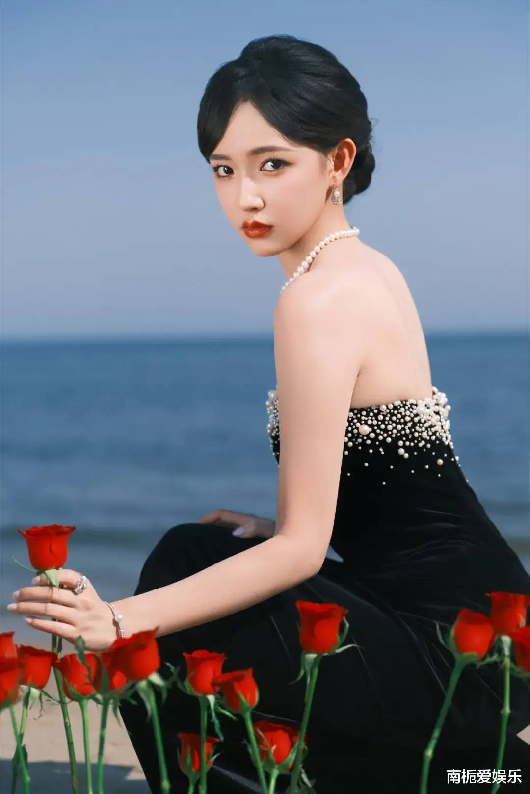 礼服以高级丝绒为底,深V剪裁极致展现锁骨与肩颈的流畅线条,背部微露设计勾勒出“雕塑般”的体态美感,裙身密布的碎钻在灯光下闪烁如星河倾泻。她缓步前行,每一步都带着从容与力量。而真正让画面升华为艺术的,是她手中那支鲜红欲滴的玫瑰。黑裙与红玫的强烈对比,犹如暗夜与火焰的碰撞,既冷艳又炽烈,瞬间定格成无数镜头下的永恒瞬间。
