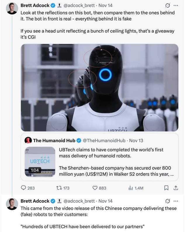 11 月 14 日,美国人形机器人公司 Figure 创始人布雷特・爱德考克在 X 平台发布逐帧分析截图,直指视频存在 “致命破绽”:“前方机器人的倒影清晰呈现地面纹理,后方机器人倒影却反射出大量天花板灯光,与真实物理光影逻辑相悖 —— 前面是真机器人,后面全是 CG 特效”。作为估值 390 亿美元的行业新贵掌舵人,爱德考克的质疑迅速发酵,# 优必选机器人是特效吗 #话题跻身热搜,部分网友联想到此前 “AI 换脸造假” 事件,调侃 “科技圈宣传全靠后期”。