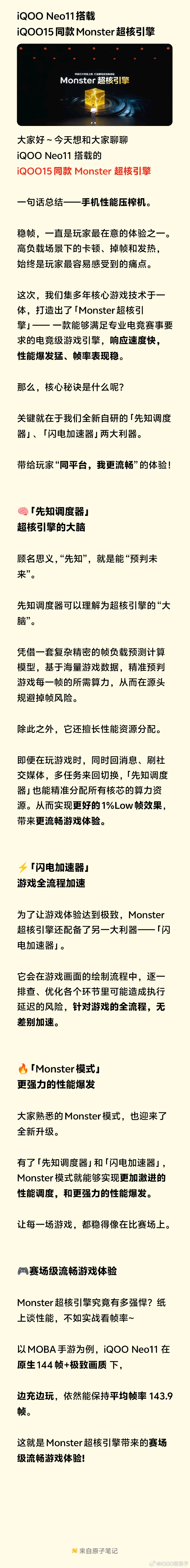 此外,日前,@iQOO手机 再次发布了Neo11在性能方面的软实力,据官宣称,“iQOO15同款Monster超核引擎!手机性能压榨机!突破芯片性能上限!打造赛场级流畅游戏体验!#iQOO Neo11#一机制胜!”其实近日, @iQOO慧慧子 也发长文截图了这一配置信息,据其称,