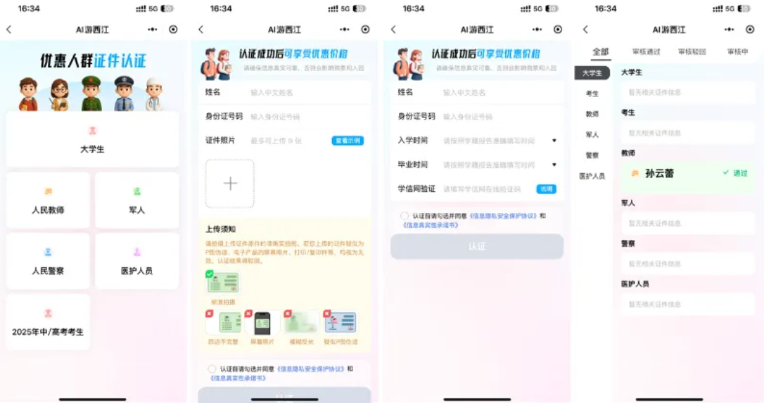 特别需要提醒的是,“AI优惠人群认证”的一大特点是擅于让AI抓住免票游客有效证件的关键识别信息,例如大学生学生证的“学信网在线验证码”、教师、军人、医护、中/高考学生证件必须要求实物拍摄(提高AI对P图的鉴别),由此提升AI的鉴别准确率。