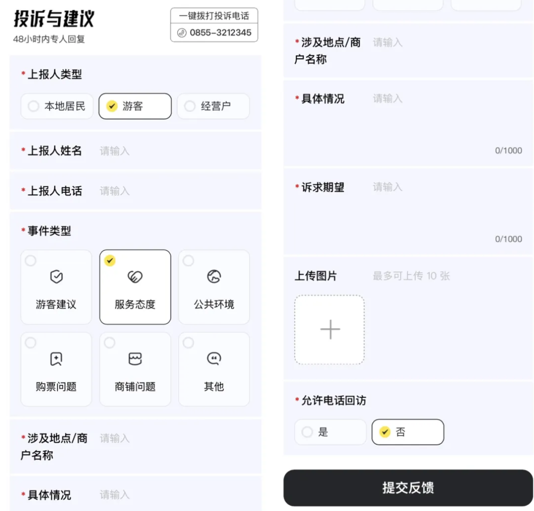 孙云蕾尝试在西江千户苗寨微信小程序“AI游西江”中推出“AI投诉建议”功能,游客有什么想法点开按钮就可以图文并茂的投诉,甚至可以要求景区快速电话回访。