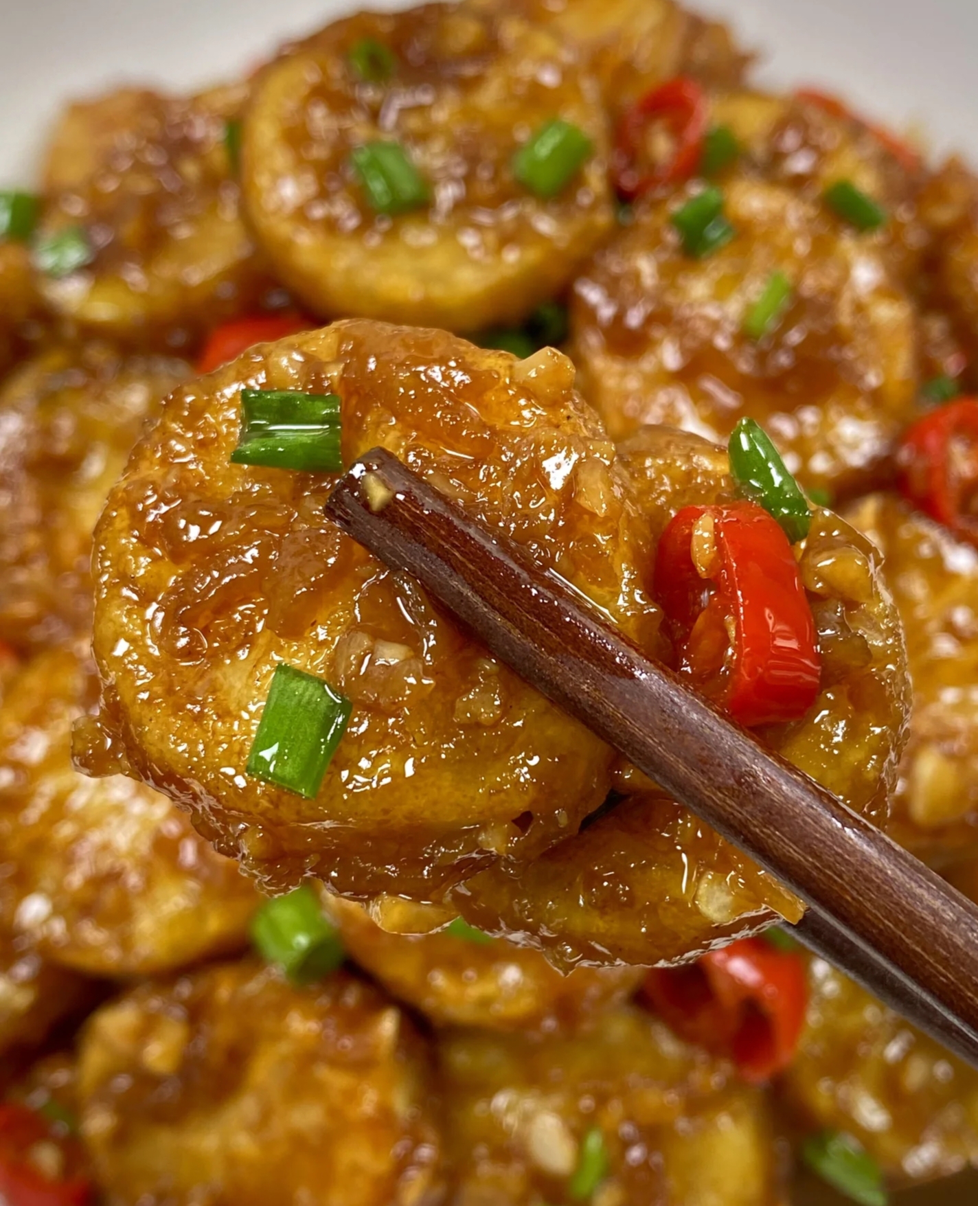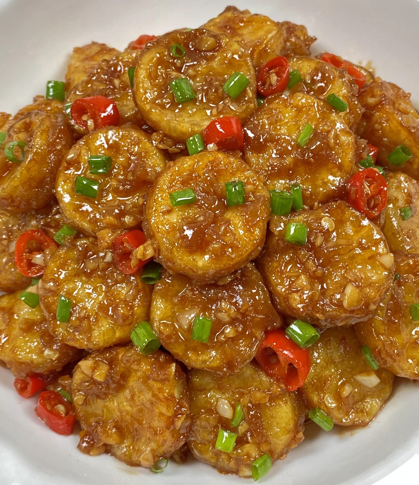 酱汁调好后,锅里留少许底油,放入蒜末爆香。蒜末的香味一出来,整个厨房都弥漫着诱人的气息。接着倒入青椒和红椒丝翻炒几下,让它们断生。然后把煎好的豆腐片放进锅里,倒入调好的酱汁,轻轻翻炒均匀,让每一片豆腐都裹满酱汁。这时候,你会看到酱汁慢慢变得浓稠,包裹着金黄的豆腐和鲜艳的彩椒,就像一幅美丽的画卷。