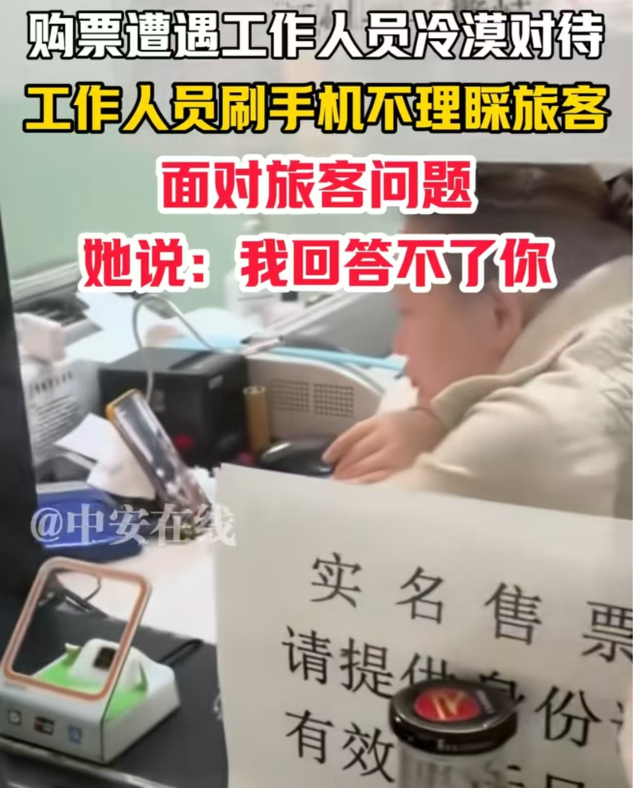 面对旅客的求助,售票员一句“我回答不了你”便草草应付了事,随后便又自顾自的刷起了手机。