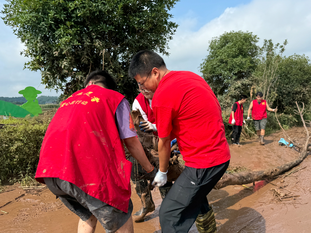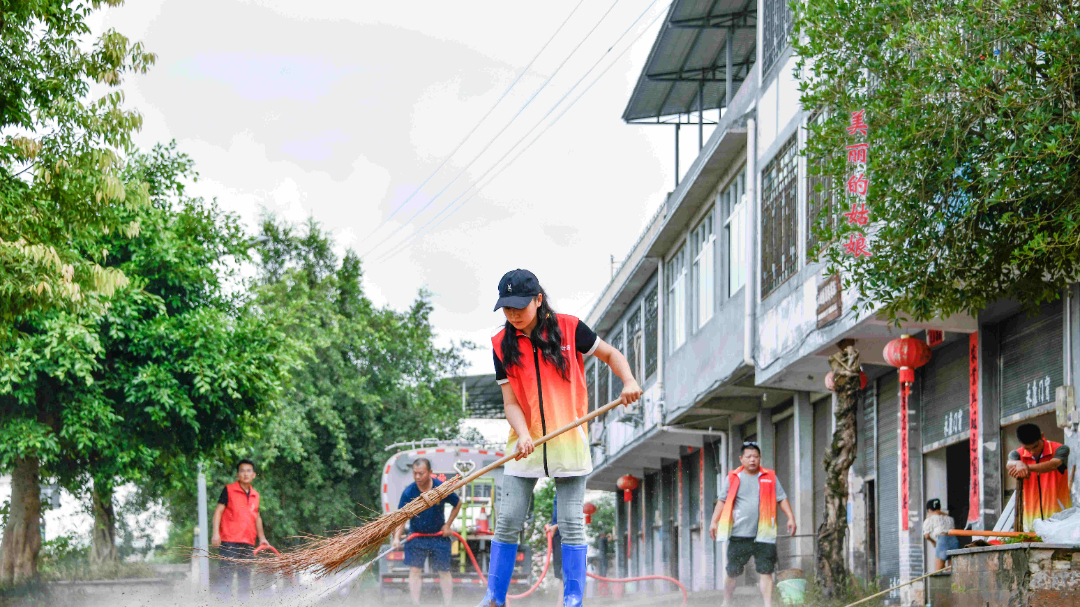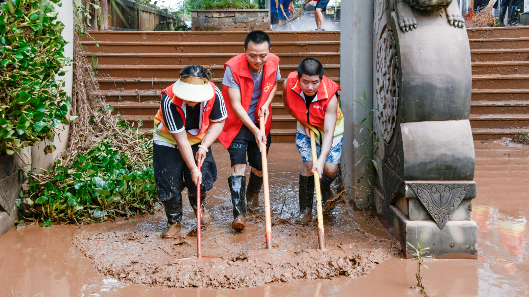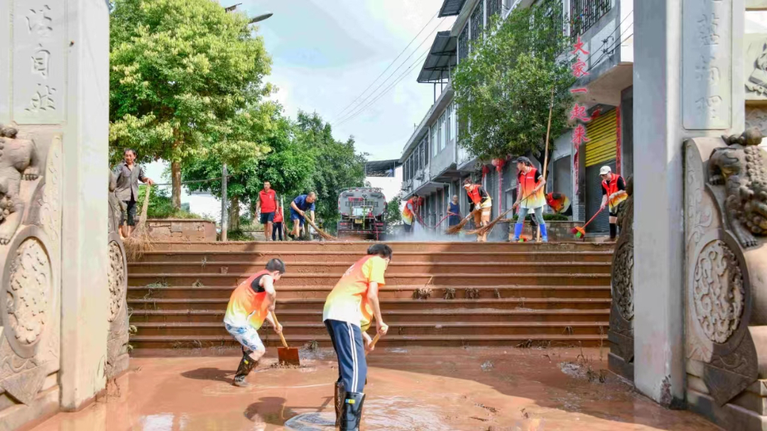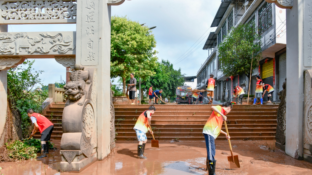 接着,志愿者们继续回到崇龛镇白沙村花街。扛水枪、用铁铲、拿扫帚……大家顶着烈日坚持作战,衣服湿了干、干了湿,累了就轮番上阵,到晚上六点半终于将淤泥清理干净。