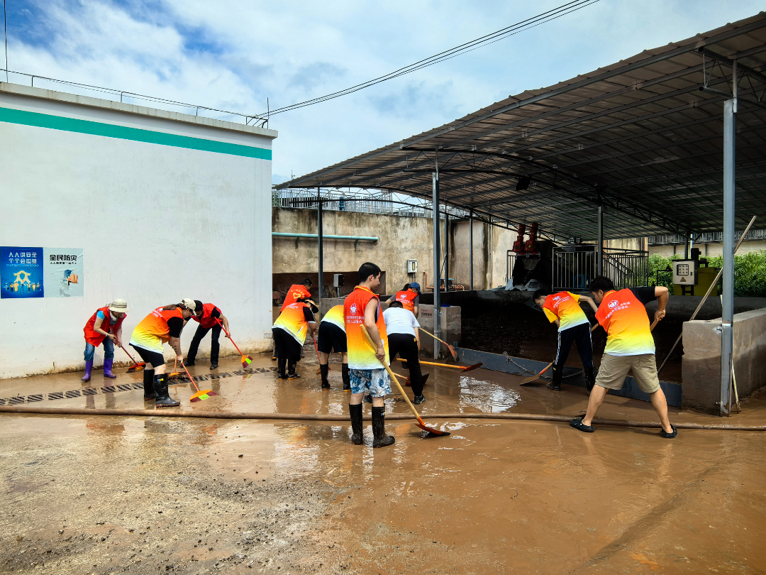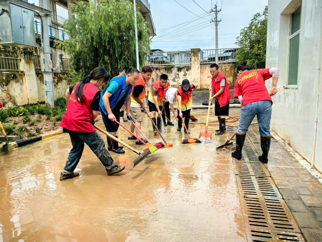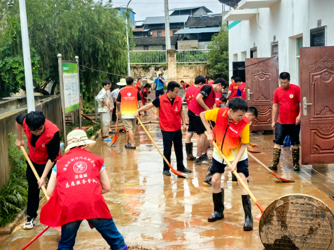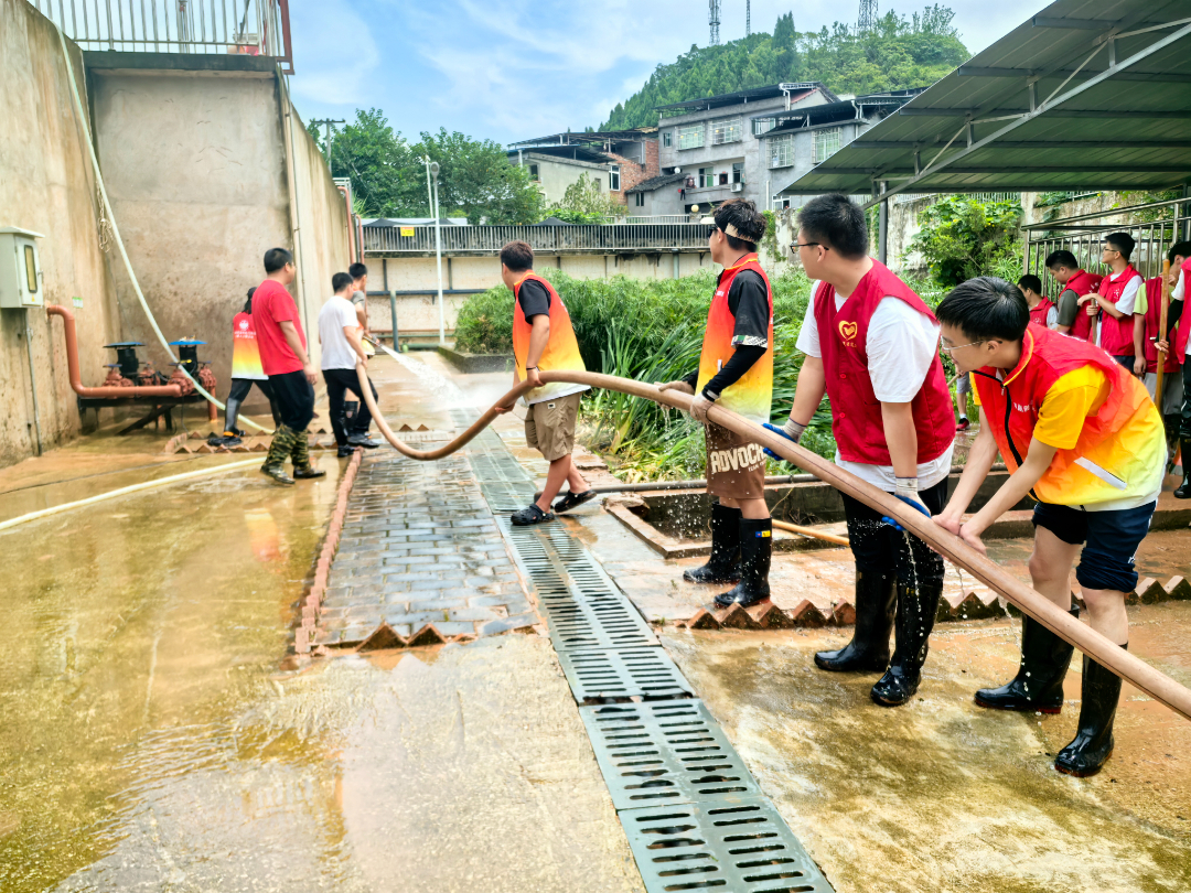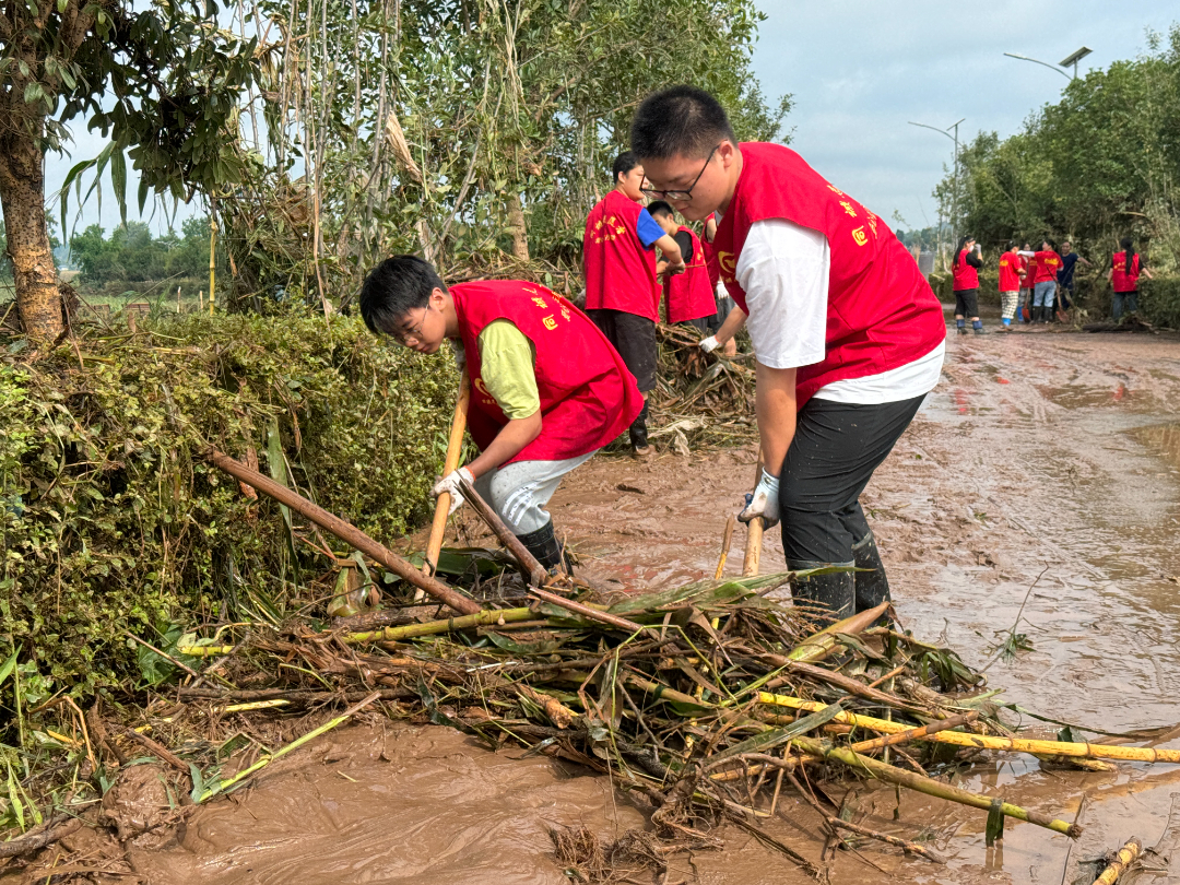 接着,志愿者们继续回到崇龛镇白沙村花街。扛水枪、用铁铲、拿扫帚……大家顶着烈日坚持作战,衣服湿了干、干了湿,累了就轮番上阵,到晚上六点半终于将淤泥清理干净。