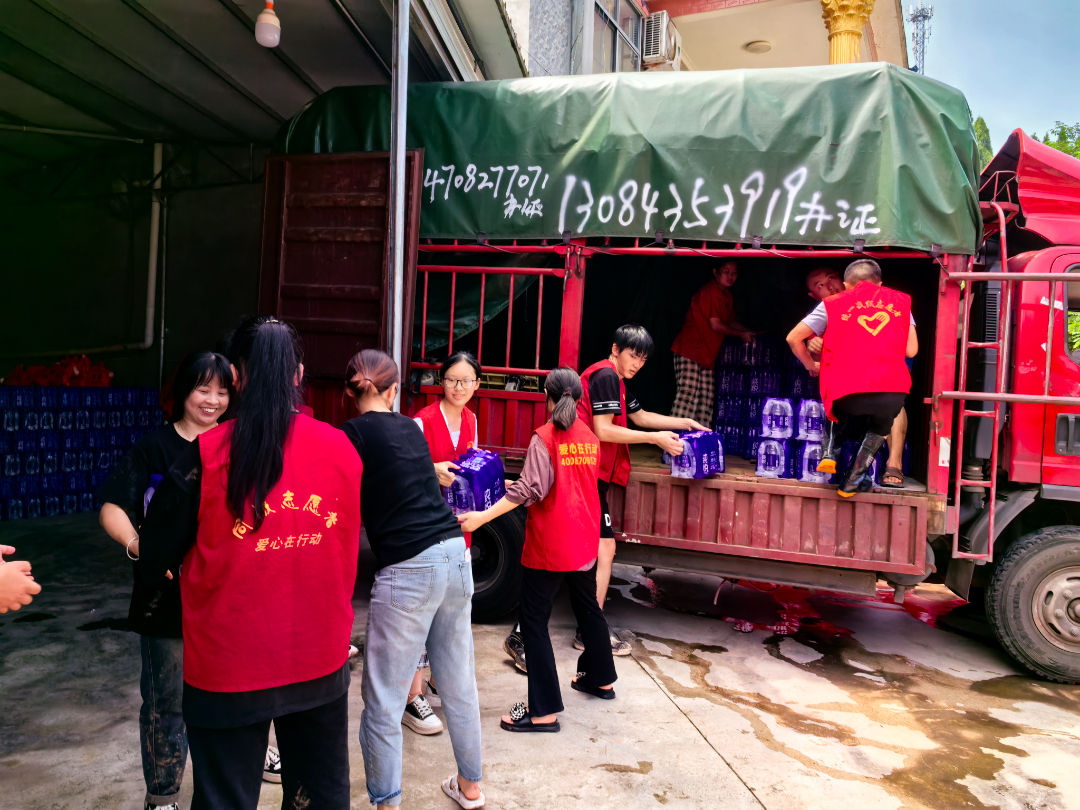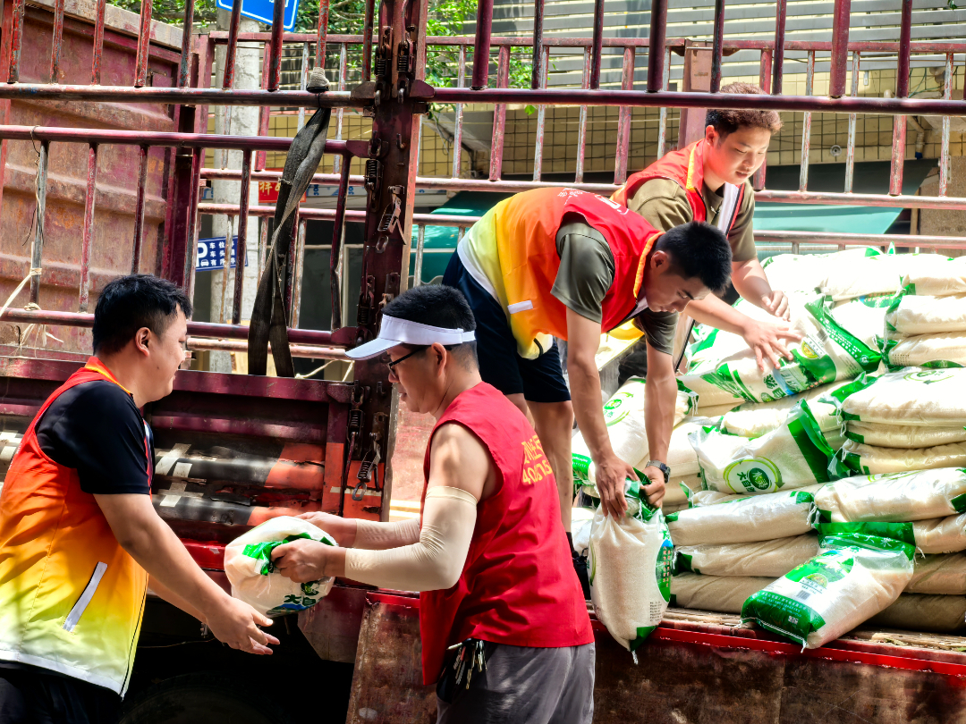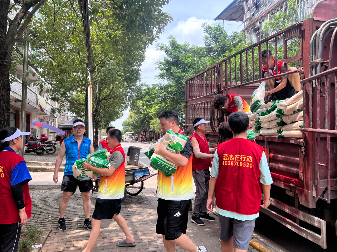 7月16日,“同心潼行”抗洪救灾服务团继续将新募集到的1500袋30000斤大米和价值1万元的消杀物资分送到崇龛、柏梓、太安三个镇,志愿者奔赴太安镇清淤。