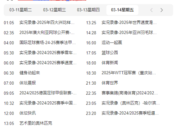 随着今天的赛事告一段落,3月14日央视体育频道CCTV5、CCTV5+的节目表已经出炉,下面一起来看看具体的赛事直播安排!