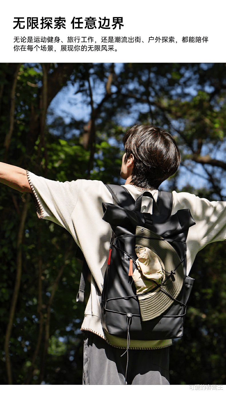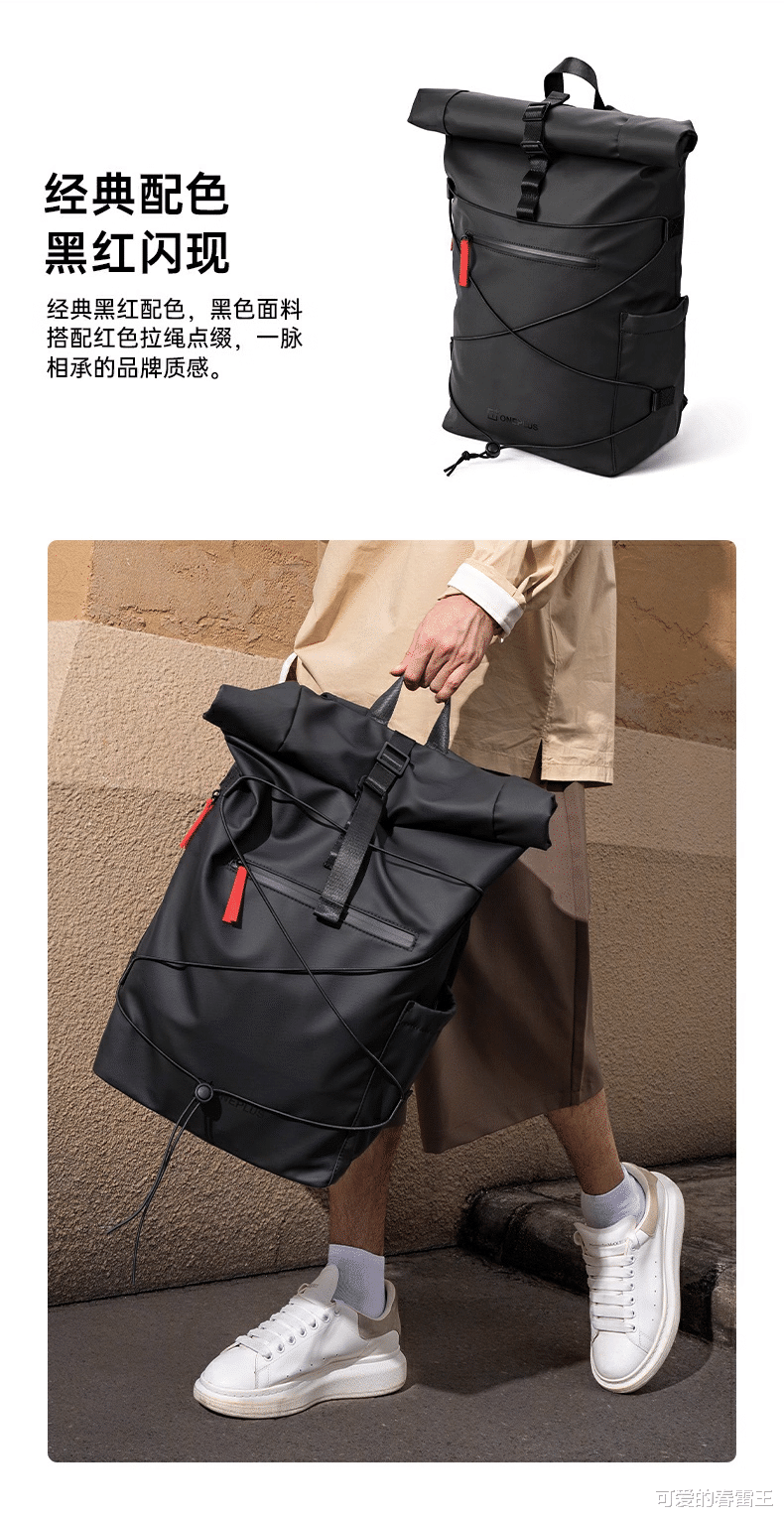 顶端就是卷起的包包可以延伸长度的,有时候包包东西塞满了,我就可以打开卷帘的部分,这样就变成更长一点的包包,继续往里装东西。