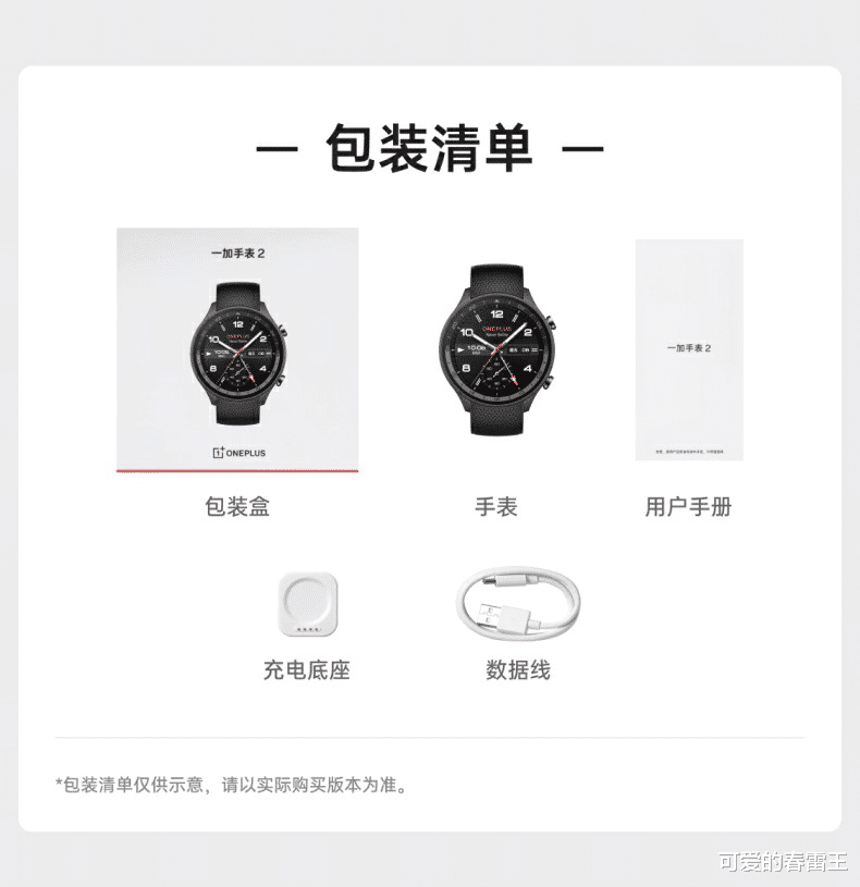 一加手表2的外包装是天地方盒子造型,非常的简洁,只有正面背面印了关键信息,我买的时候收到的就是表跟表带,用户手册、充电数据线、分体式充电底座,这里夸一下,分体式的充电底座,使用触点给手表充电,支持OPPO VOOC快充,带有磁吸功能,我一般直接放上去就可以充电了,充电座才13克,像我周末戴着出去玩都可以顺便带着走,很方便。