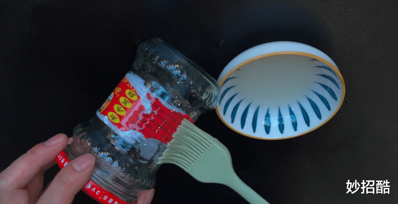 然后用刷子蘸取食用油,涂在瓶子上的胶印处,确保胶印被食用油全部刷透覆盖。