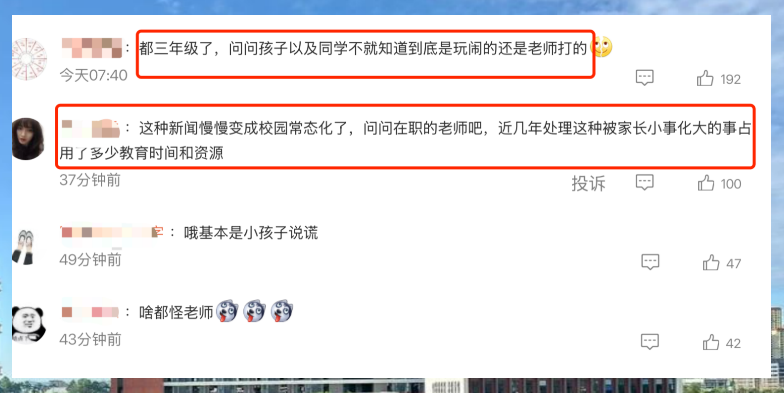 翻看评论区网友评论,更能窥见当下家校关系的深层症结。一条获得上百点赞的评论抱怨,这类事件已“常态化”,老师们耗费大量教育时间和资源去处理被“小事化大”的家长投诉。这条评论能引发广泛共鸣,本身就说明了许多一线教师的疲惫与无奈。与之相呼应的是“啥都怪老师”的吐槽,以及更直接的“我已经不再相信家长了”的宣言。这种情绪的蔓延,远比一两个孩子的伤口更难愈合。