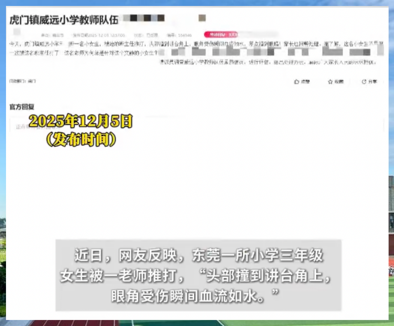 近日,东莞一所小学的三年级学生受伤,家长报警,演变成一场席卷全网的风波。家长在网络上控诉,称孩子被老师推打,头部撞上讲台