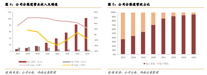 仅两年,珀莱雅线上渠道营收占比从四成多提升至七成。2024年,公司线上渠道占比高达95.1%,今年上半年增至95.39%。