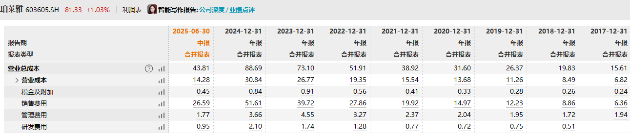 粗略统计,珀莱雅2018年以来累计研发投入8.82亿元,不足2018年一年的销售费用8.86亿元。