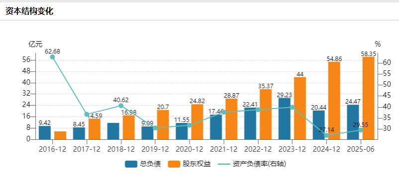 截至今年6月底,珀莱雅货币资金46.33亿元,负债总额24.47亿元,流动负债15.87亿元。2024年、今年上半年,公司资产负债率分别是27.14%、29.55%。