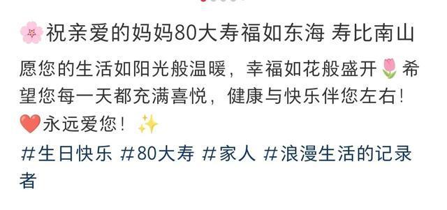 从吃瓜群众的角度来看,黎姿为妈妈庆80大寿这件事,让我们看到了娱乐圈中不一样的风景。它既有明星的光环,又有家庭的温馨。在这个充斥着各种话题和流量的娱乐圈里,像这样的家庭情感事件就像是沙漠中的绿洲,让人感到温暖和慰藉。