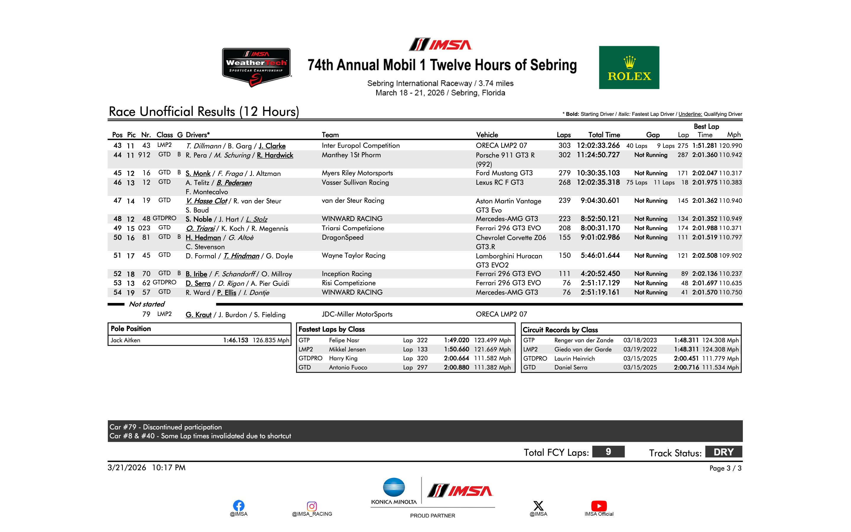 比赛还剩不到两小时,Jonny Edgar(AO Racing车队)领跑LMP2组,Hunter McElrea(United Autosports USA)以3.4秒差距位居第二。Lorenzo Patrese(Conquest Racing)在GTD组领先Lone Star Racing的Lin Hodenius 13秒。