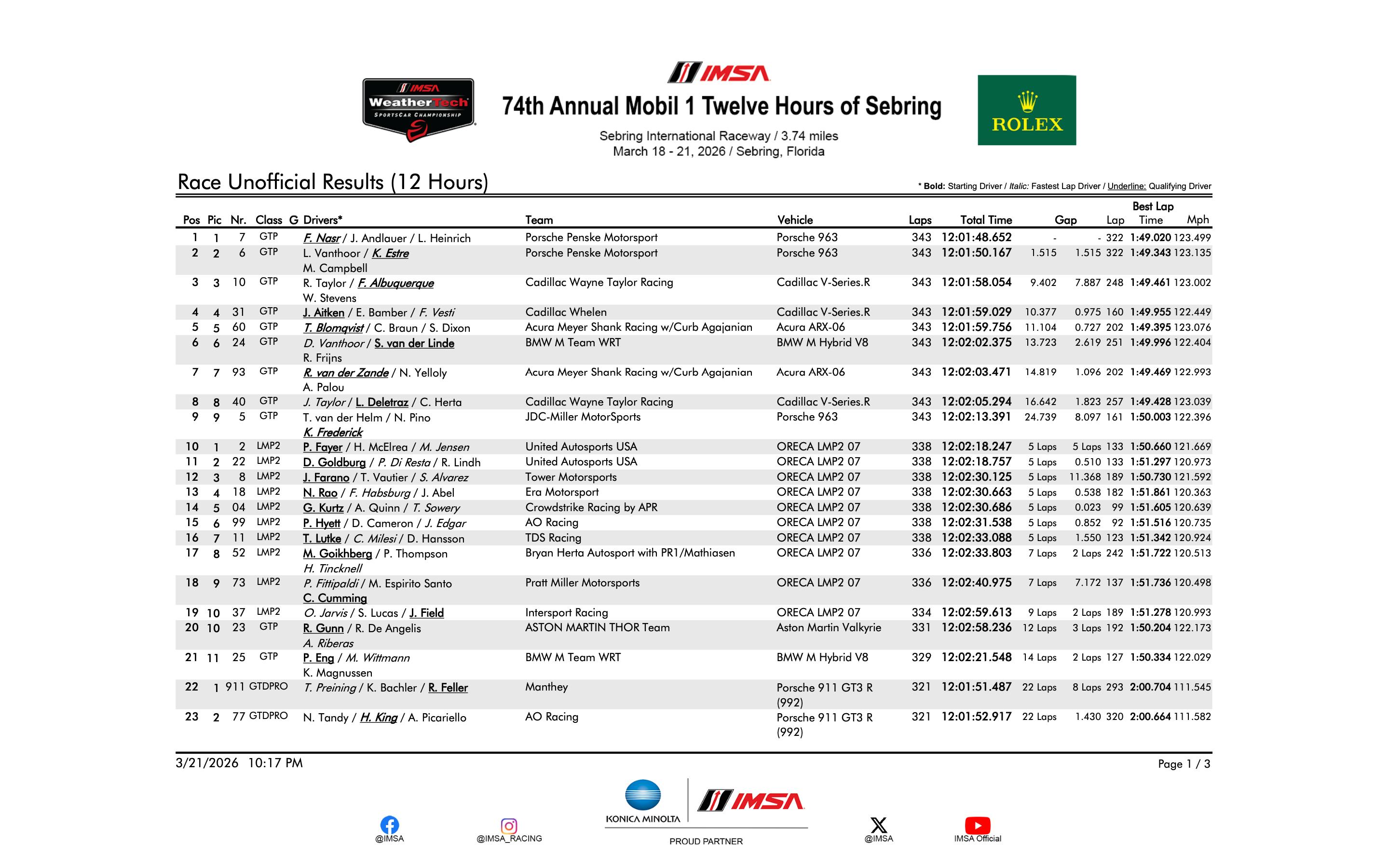 佛罗里达的阳光穿透云层,洒在赛百灵国际赛车场粗糙的混凝土赛道上,轮胎摩擦地面的嘶吼与引擎的轰鸣交织成最激昂的旋律。2026年3月21日至22日,第74届美孚1号赛百灵12小时耐力赛如期上演,这条承载着70余年赛车传奇的赛道,再次迎来全球顶尖耐力赛车队与车手的巅峰对决。