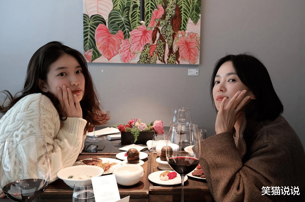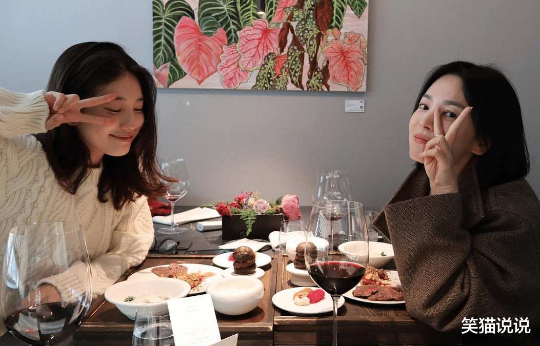 秀智也晒出了和宋慧乔的合照,照片中的宋慧乔闭着眼托着腮,露出愉快的笑容。而秀智则是闭着眼嘟嘴,像是隔空撒娇一样,氛围感特别好。