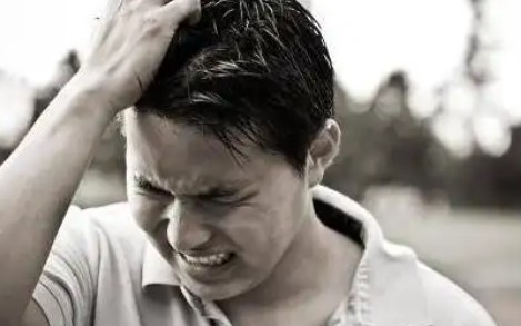 年轻男人一头淡黄色卷发,身穿白色休闲装,正一脸郁闷地瘫坐在位置上。