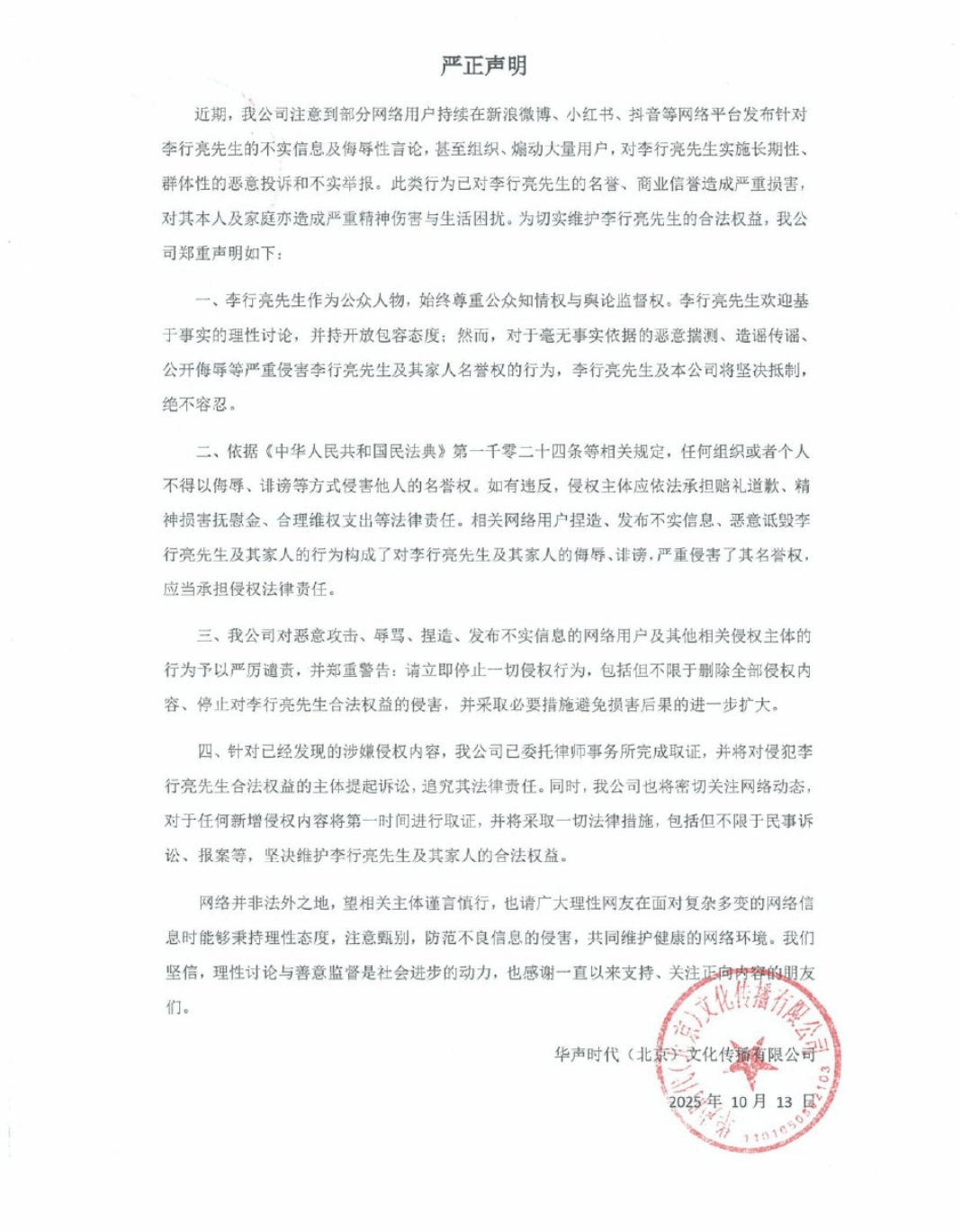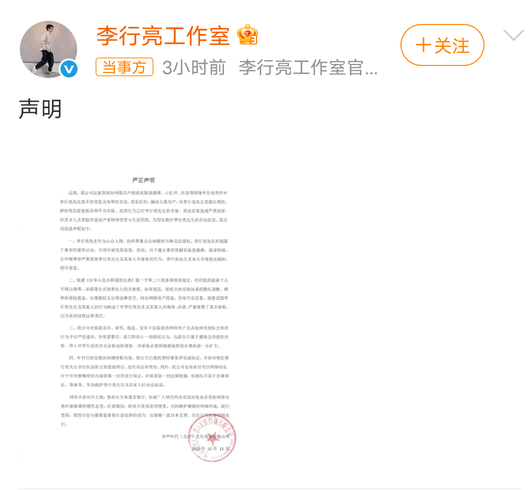 这要是搁在咱普通人身上,可能早就心态崩了。可李行亮不愧是见过大场面的明星,直接发了篇千字长文,洋洋洒洒地把事情的来龙去脉都讲清楚了,还明确表示要用法律的武器捍卫自己的权利。这架势,简直就是娱乐圈的“维权斗士”上线了!