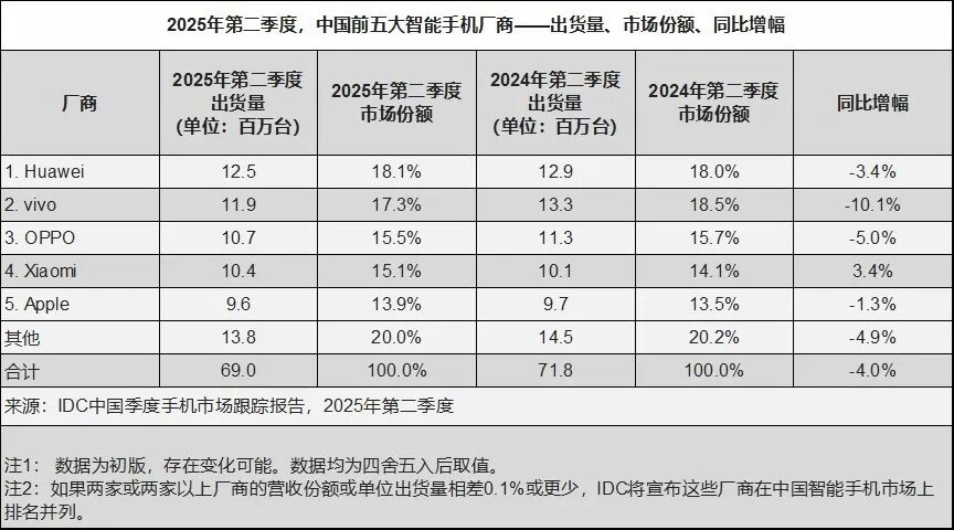 IDC统计的数据显示,2023年-2024年中国智能手机市场,iPhone的出货量分别同比下跌2.2%、5.4%,市场排名分别为第一和第三。2025年Q2,iPhone的出货量仅为960万台,同比下跌1.3%,位列第五。